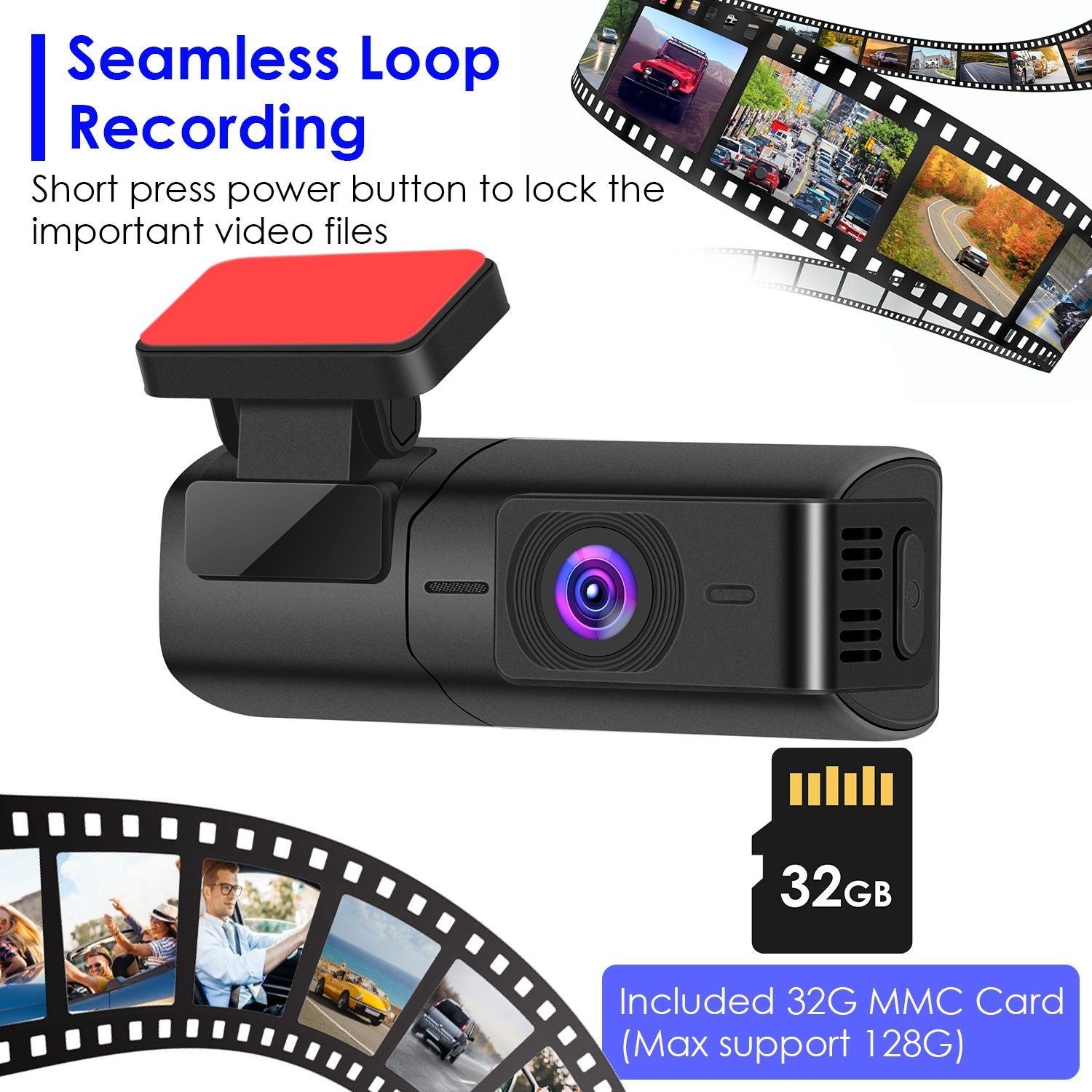 *Included 32G Card & Seamless Loop Recording*:Come with included 32G MMC storage card,our front car dash cam supports 1/2/3minutes seamless loop record. When the memory card is full,the camera will automatically overwrite old videos with newly recorded ones,promising you always have access to latest ones. Short press the power button to lock the important video files,preventing them from being lost or overwritten.