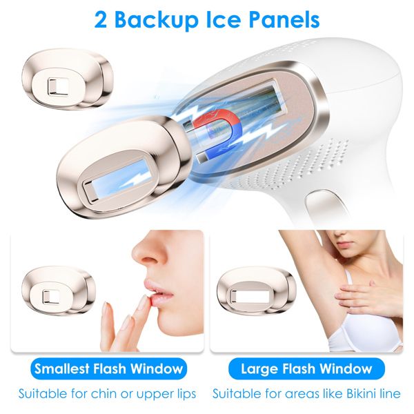 - Ice Cooling & Painless: Paired with cool ice panel on the falsh window, our Bikini line hair removal keeps your skin temperature ar low as 6°C/42.8°F, which soothes the burning sensation and won\'t cause skin redness. Make the hair removal treatment painless and skin-friendly. Note: For changing the ice panel, you can make use of the magnetic function on the original ice panel.