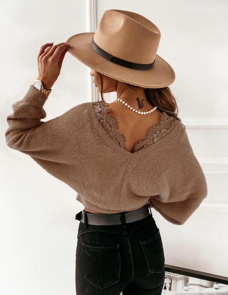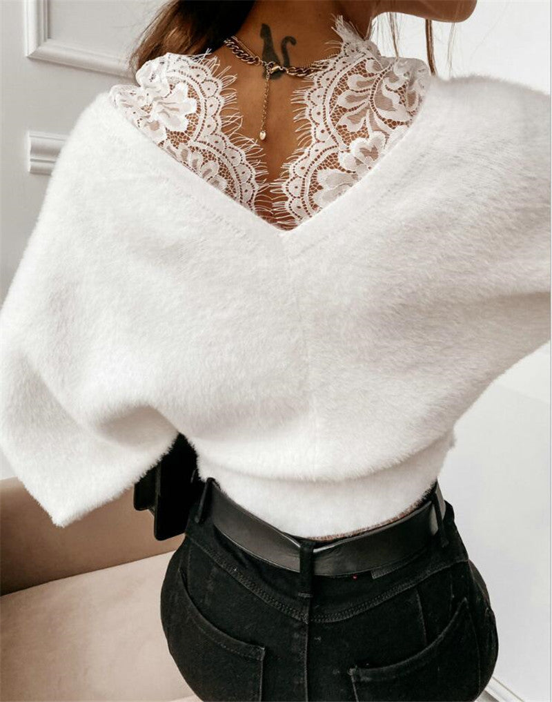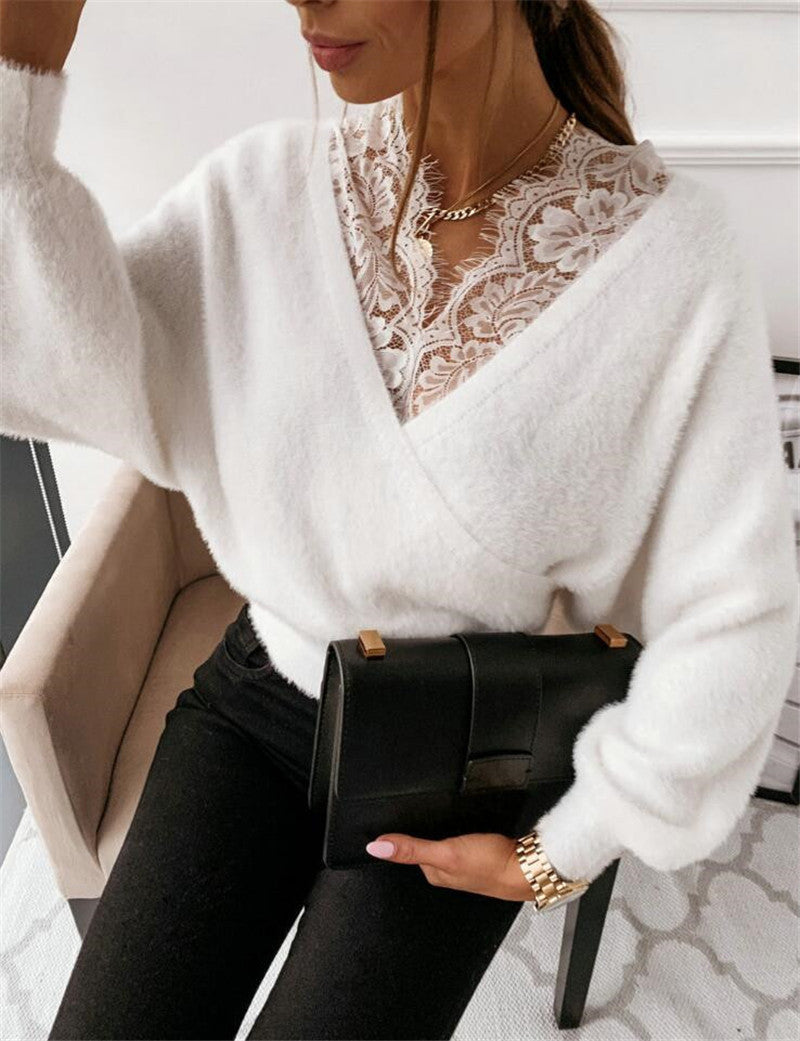 Autumn Winter Sexy Solid Color Lace Strap Flannel Long Sleeved Top