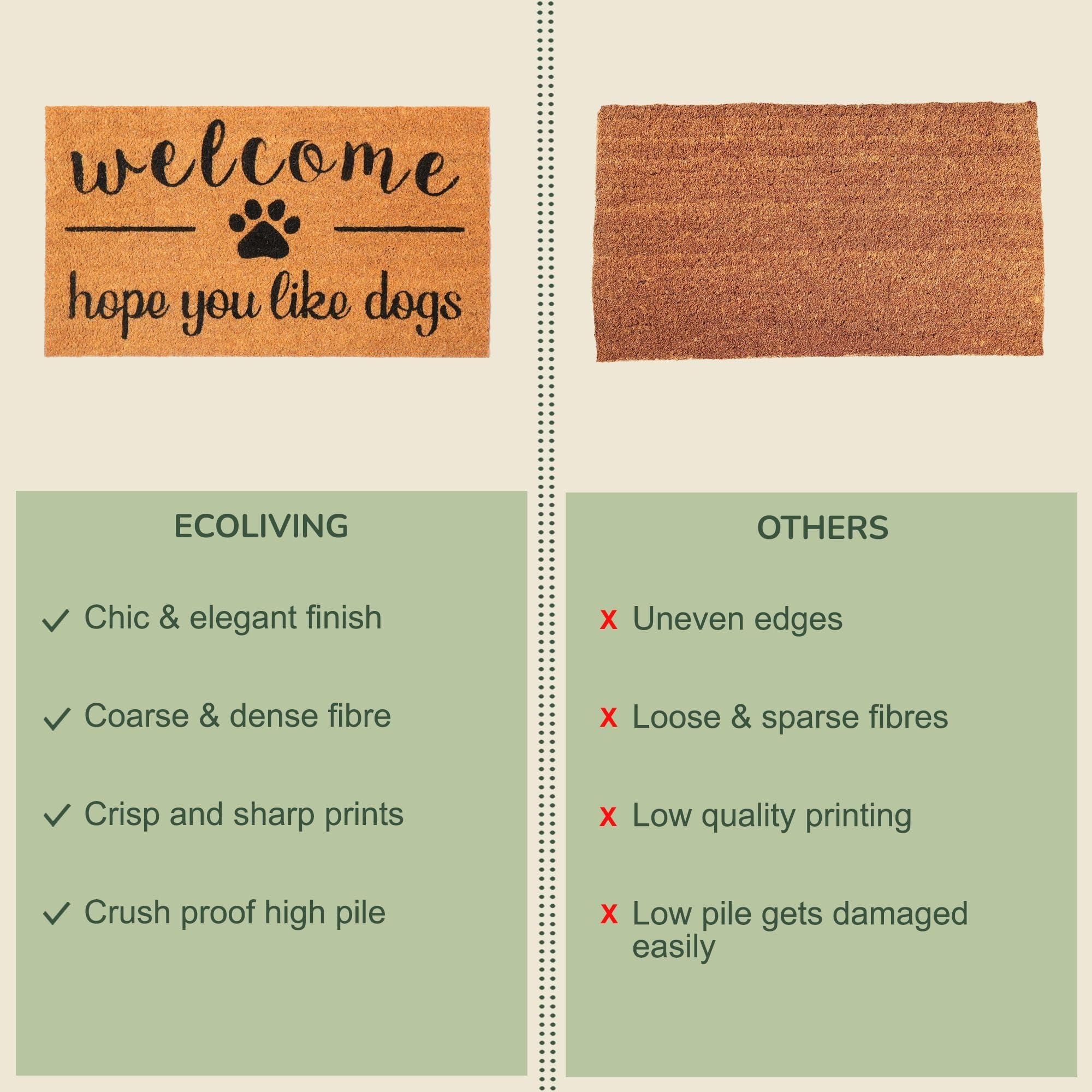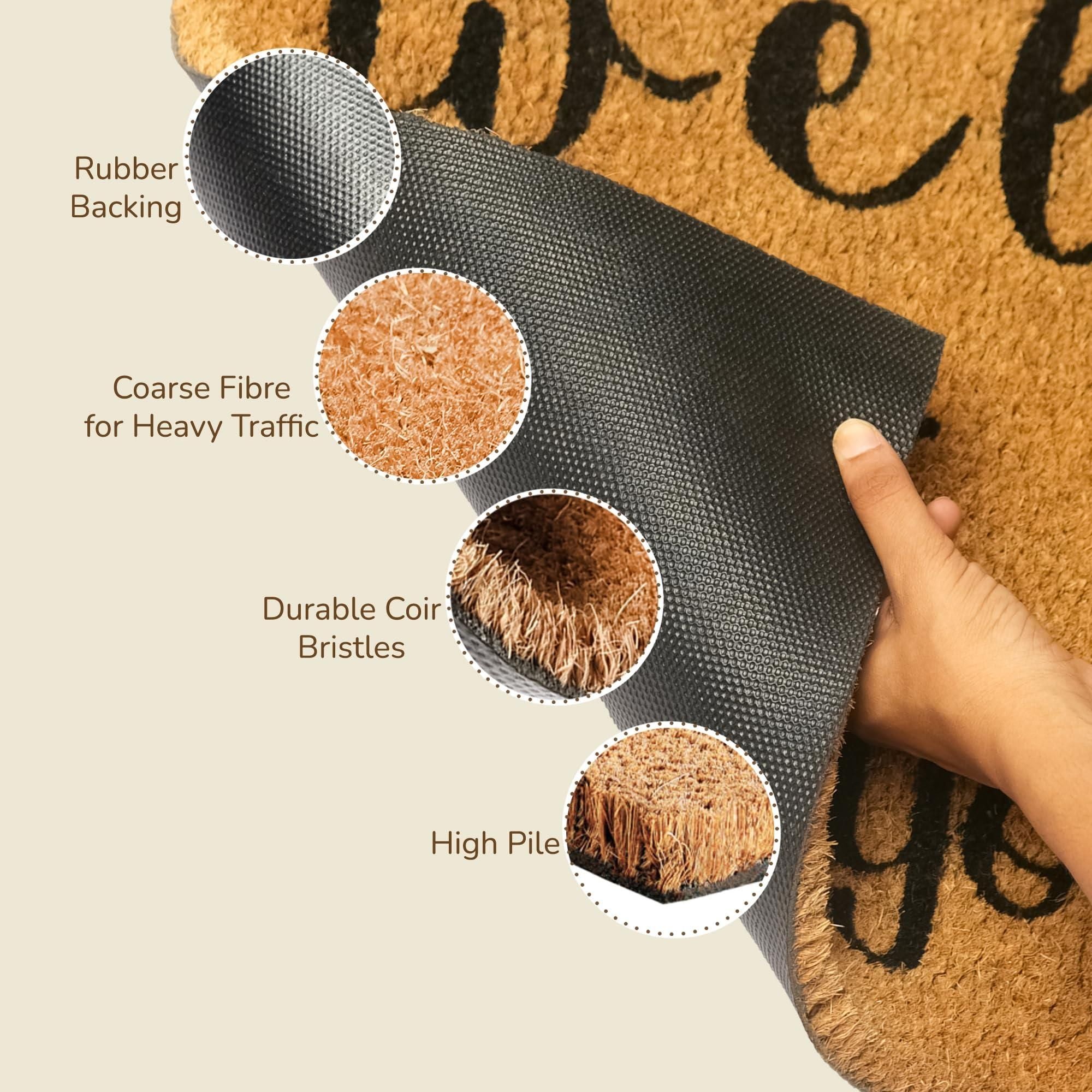 natural coconut coir doormats: eco living doormats are made from natural coconut coir material. the coir in our welcome mats is durable and withstand heavy foot traffic and outdoor elements. they are perfect for both indoor and outdoor use. moreover, our front door mat for outdoor entrance and balcony makes an excellent and beautiful eco-conscious door and home decor.