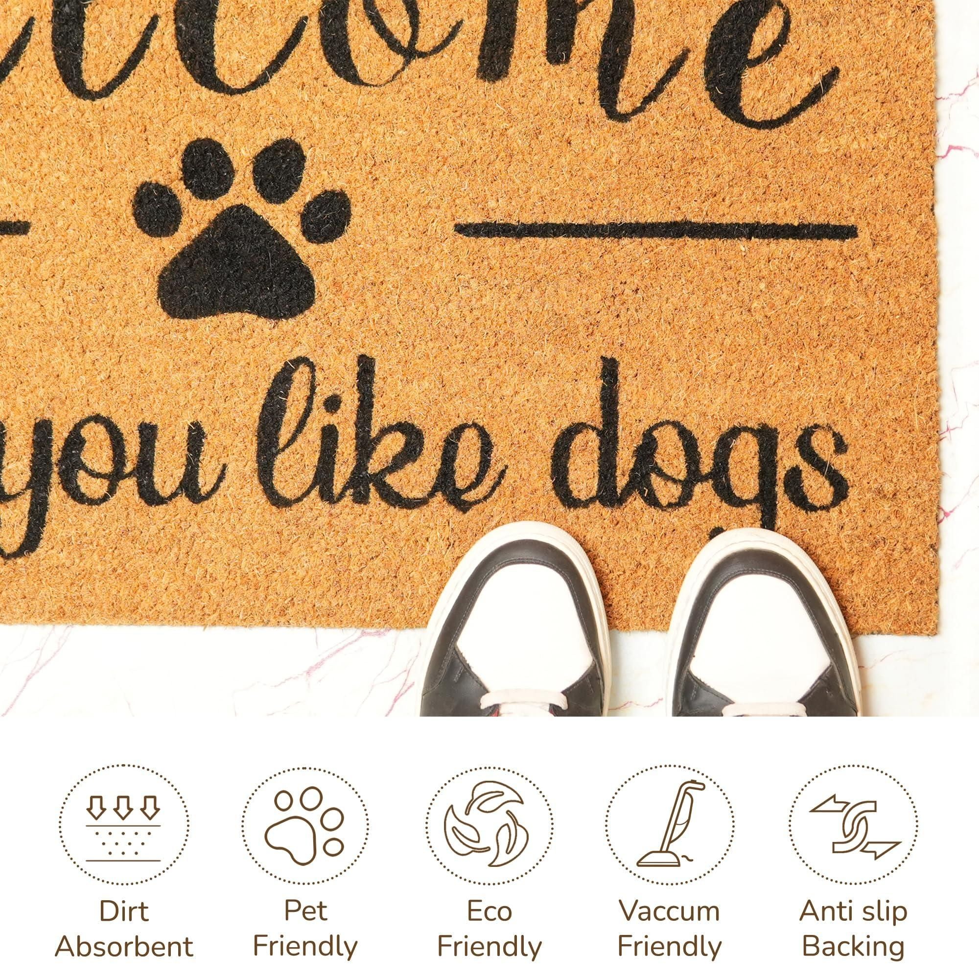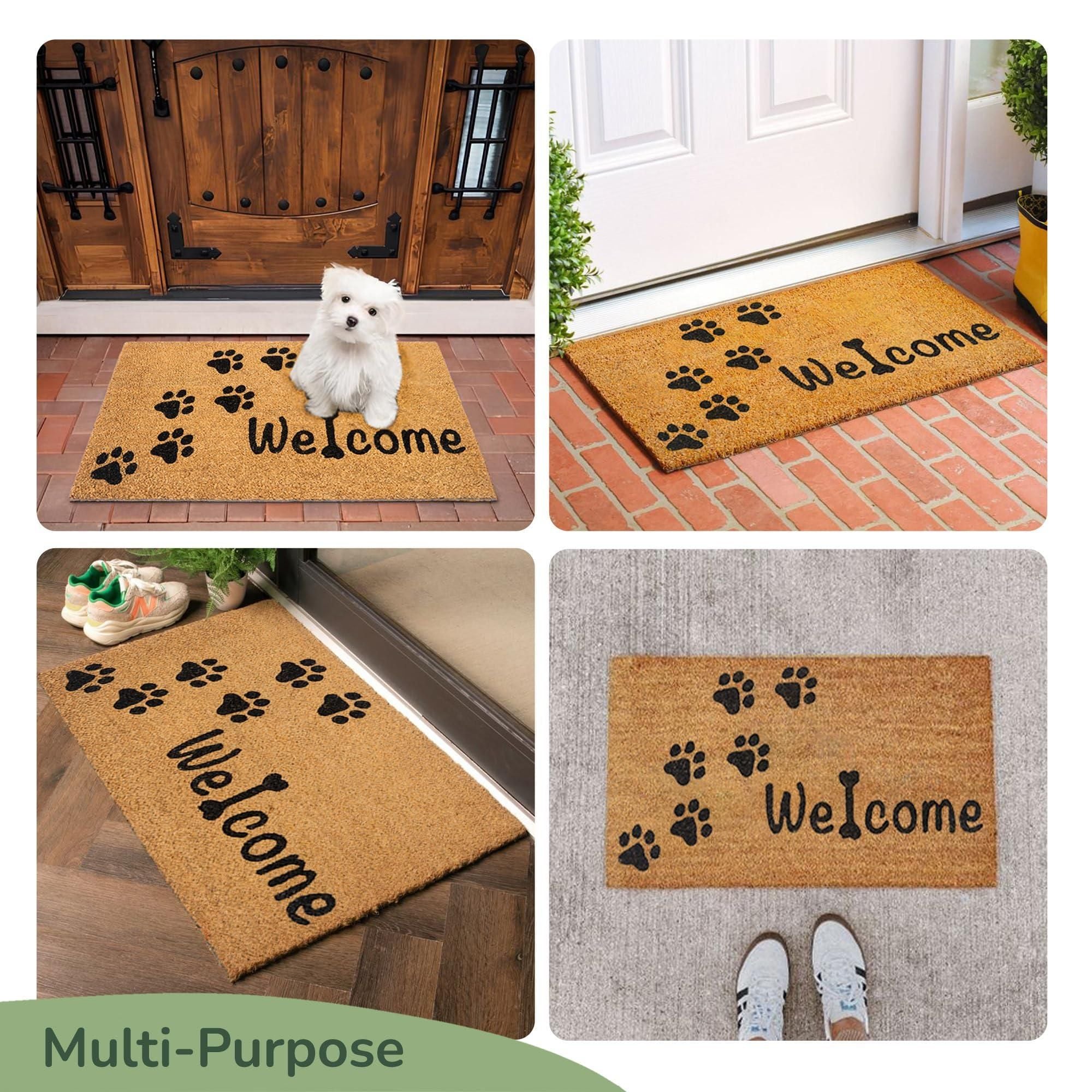beautiful design that suits any decor: our outdoor welcome mat feature beautiful cat prints that do not fade over time and creates a welcoming ambiance. these indoor doormat features "woof," "welcome with paws print," "please wipe your paws," and "welcome hope you like dogs," adding a touch of personality to your front porch, entryway, indoor home entrance, kids room, and more.
