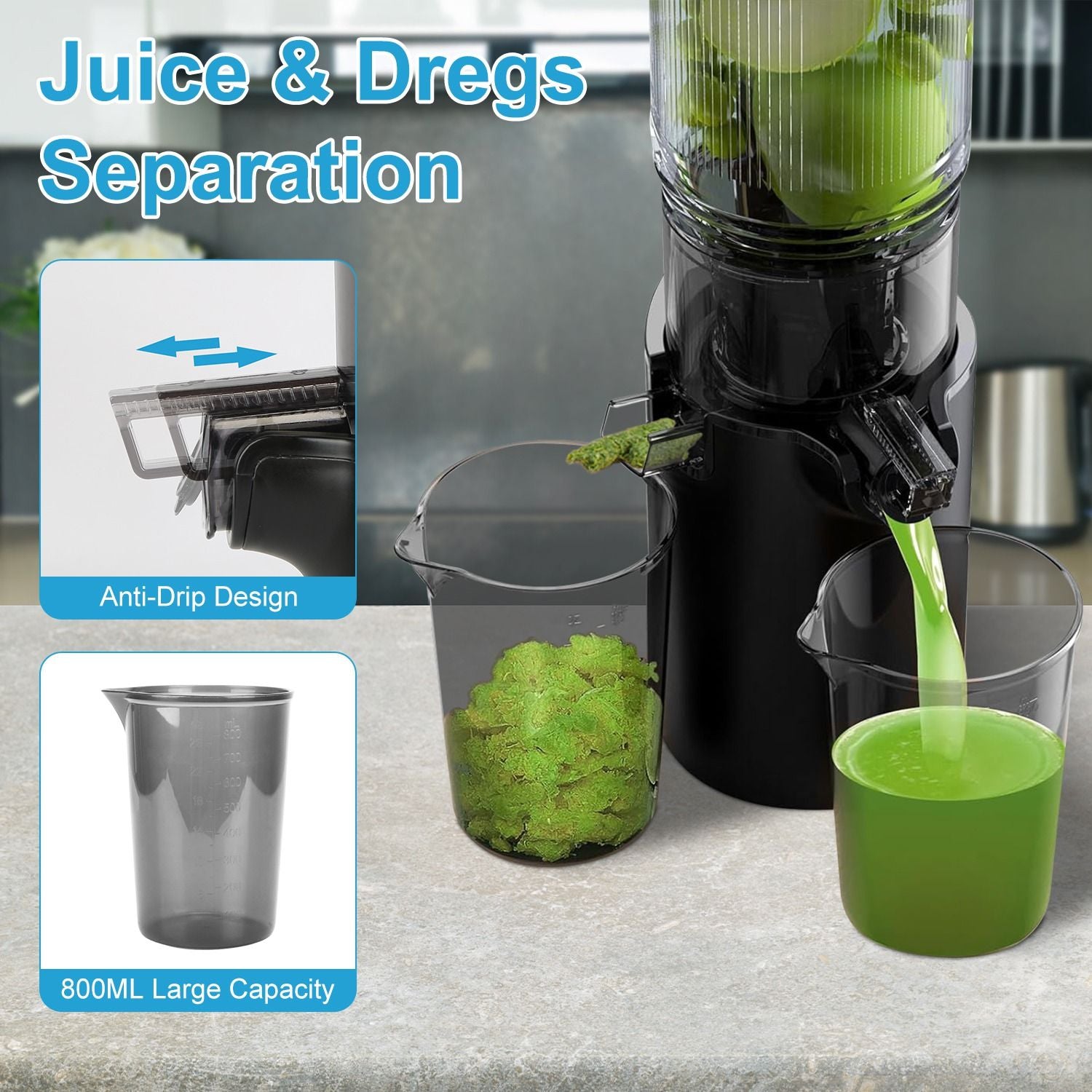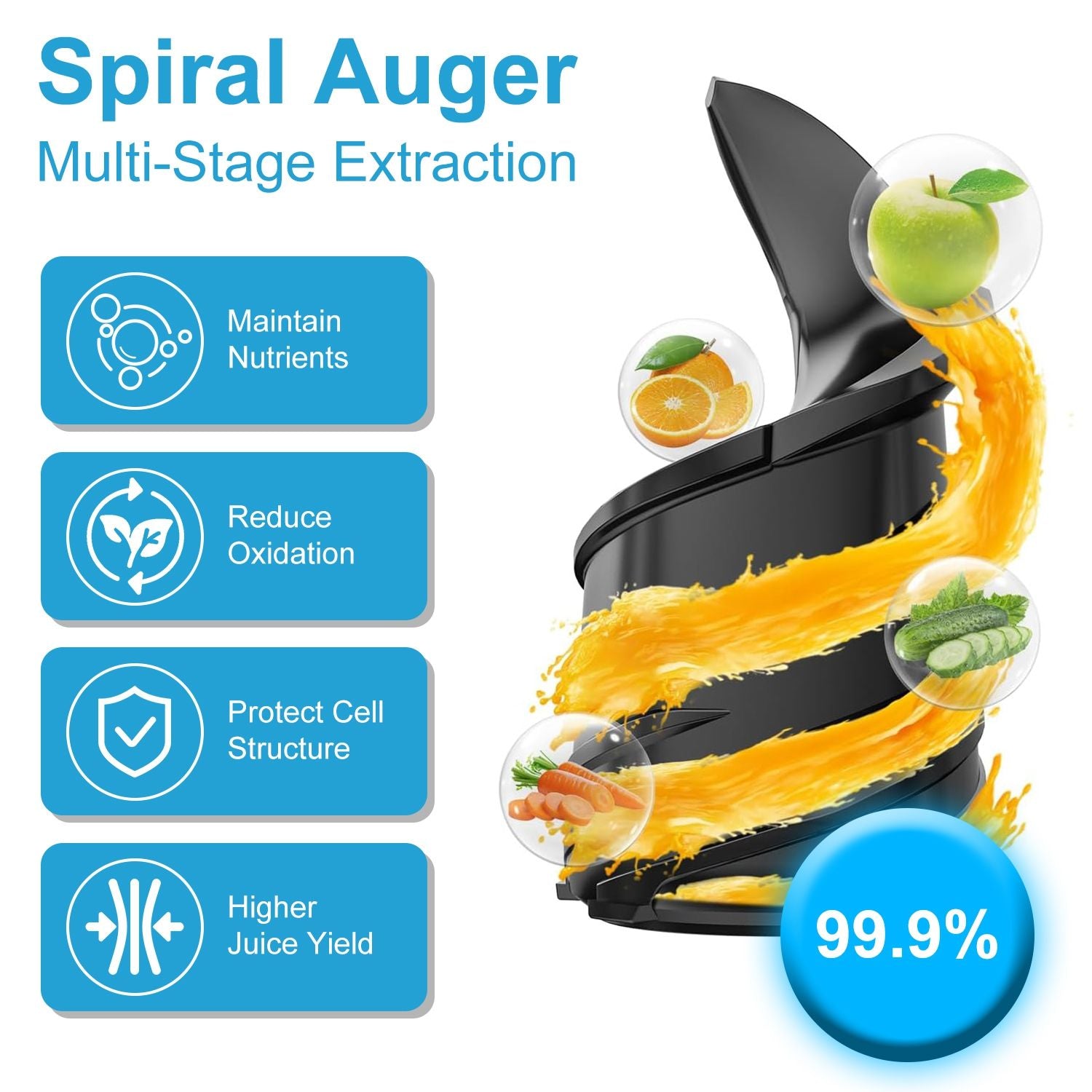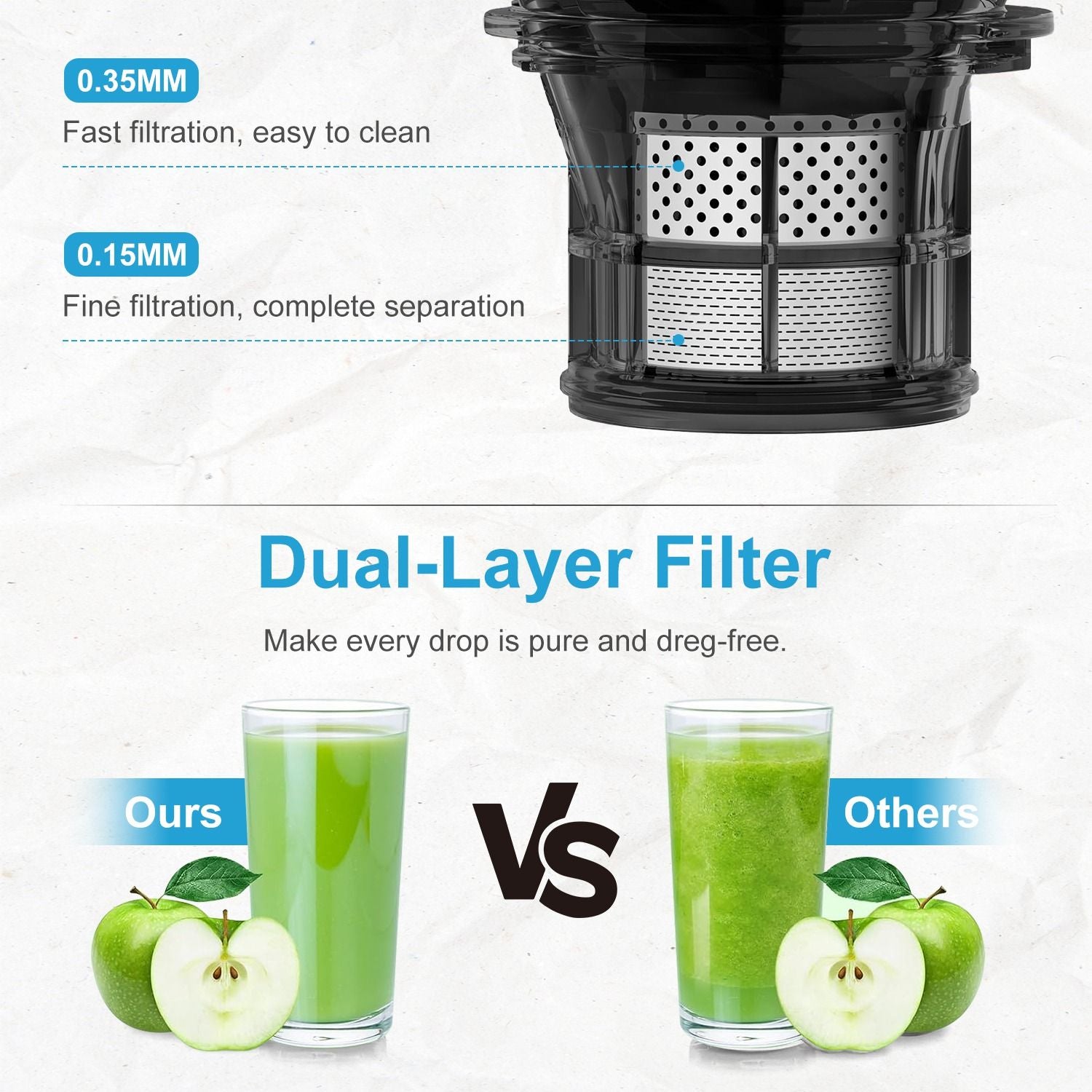 *99.9% Efficient Juice Yield*:Dual-layer stainless steel filter completely separates the juice from fruit dregs,ensuring that every drop of juice extracted is pure and free from any unwanted dregs or residue. Food-safe spiral auger head maximizes your juice yield with an impressive extraction efficiency of up to 99.9%.