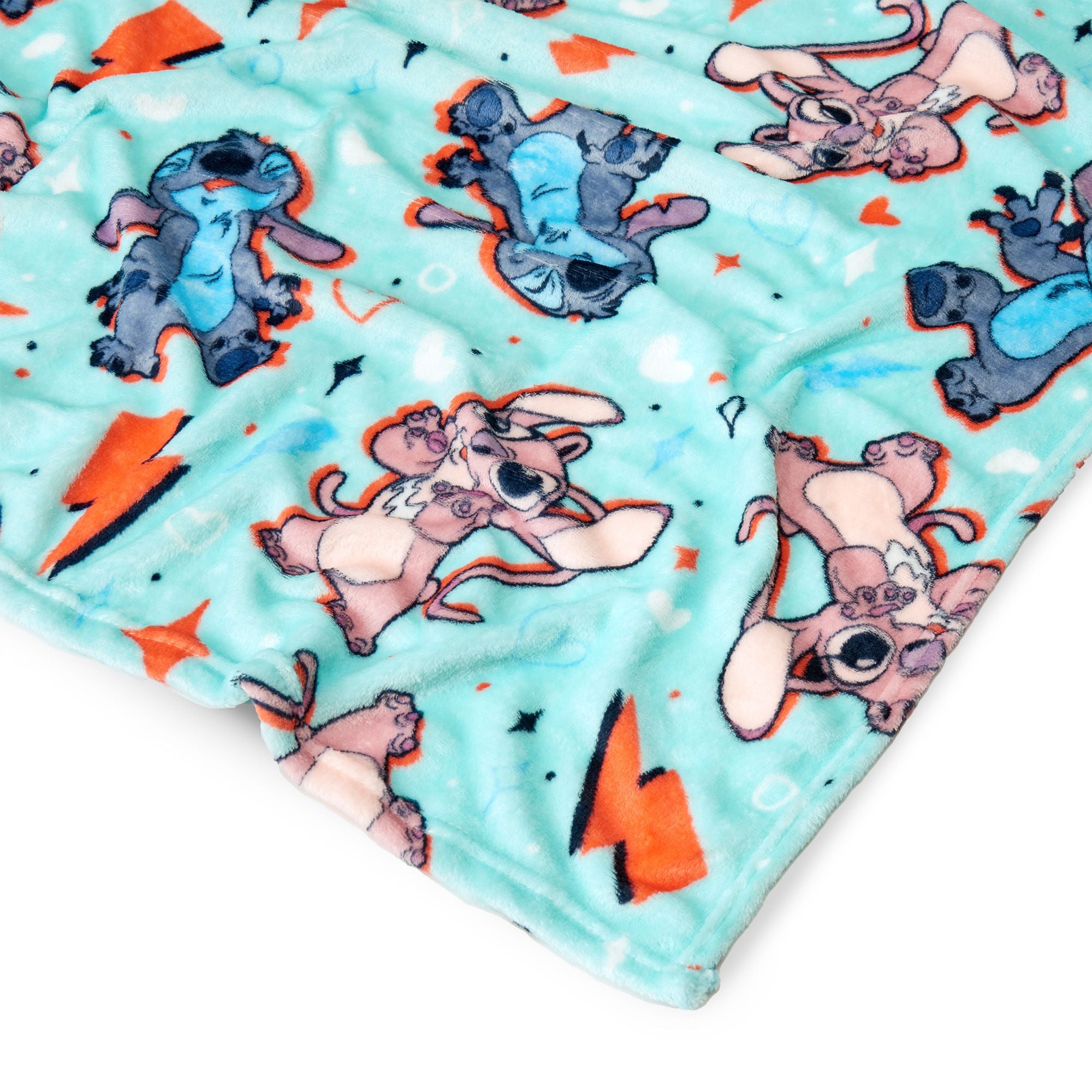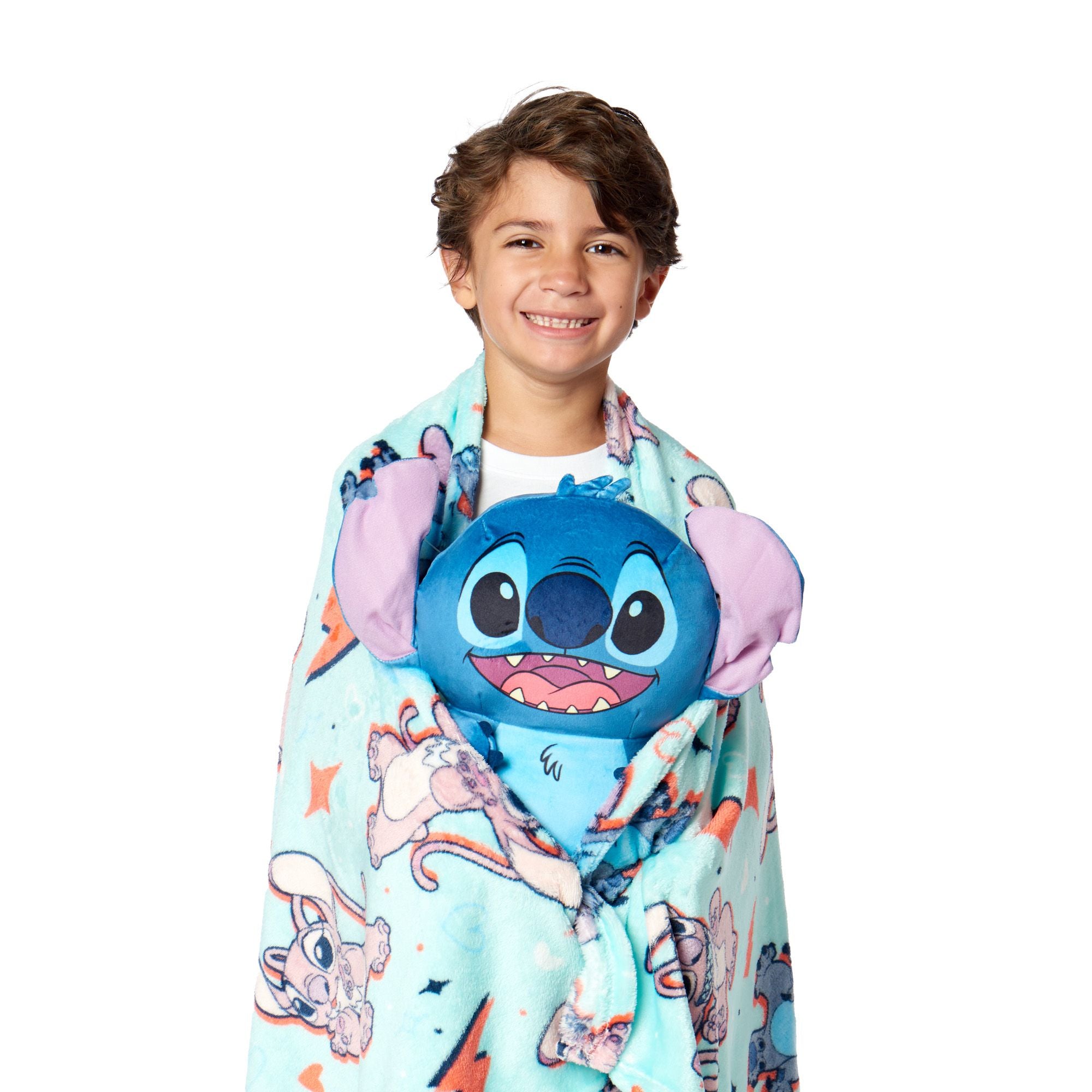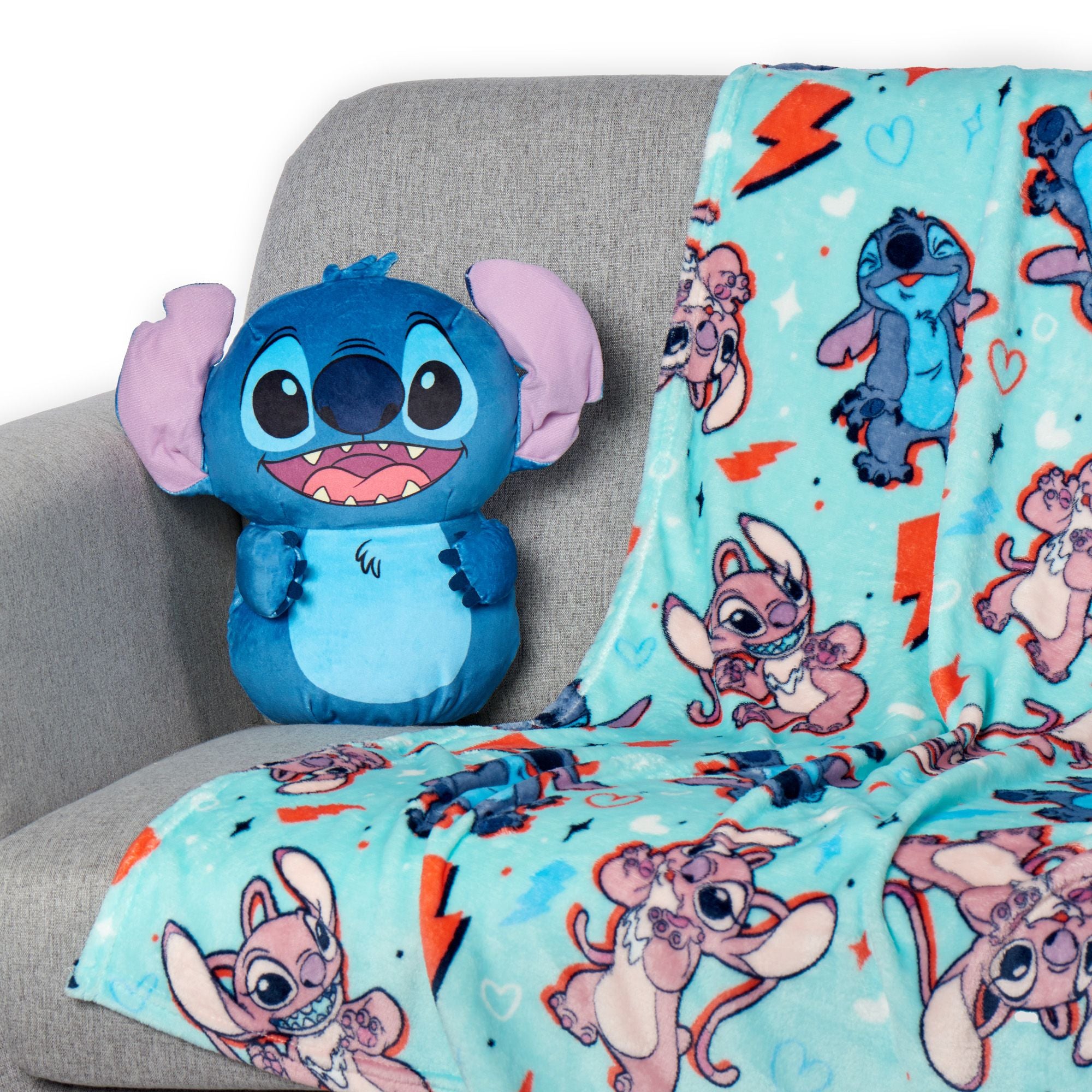 Features Stitch and Angel surrounded by lightning bolts, hearts, and other fun images on the balnket, the adorable Stitch hugger pillow, designed to look just like the mischievous blue alien himself.