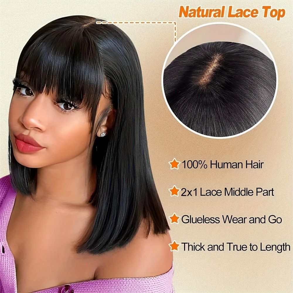 Elegant Straight Bob Human Hair Wig with Bangs - 180% Density, Glueless HD Lace Front, Natural Scalp Coverage, Vacation-Style for Women, Short Hair Wig