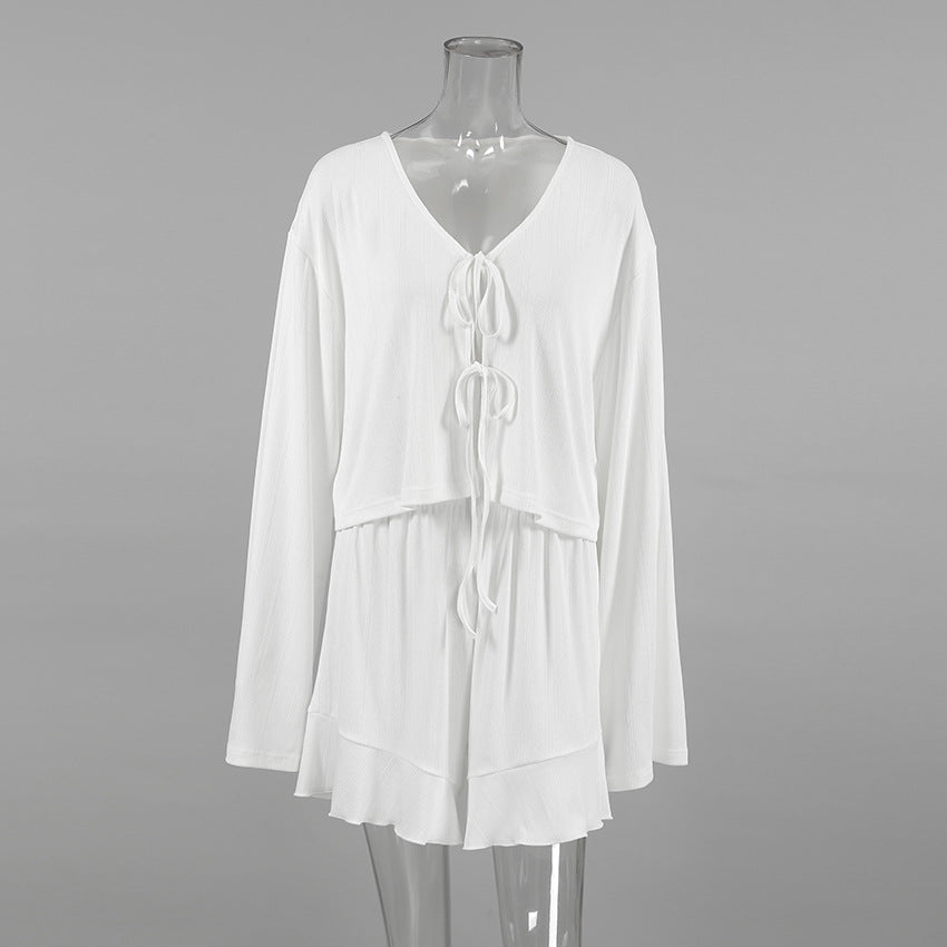 Fall White Long Sleeved Cardigan Tied Lotus Leaf Shorts Pajamas Jacquard Hollow Out Cutout out Ladies Homewear