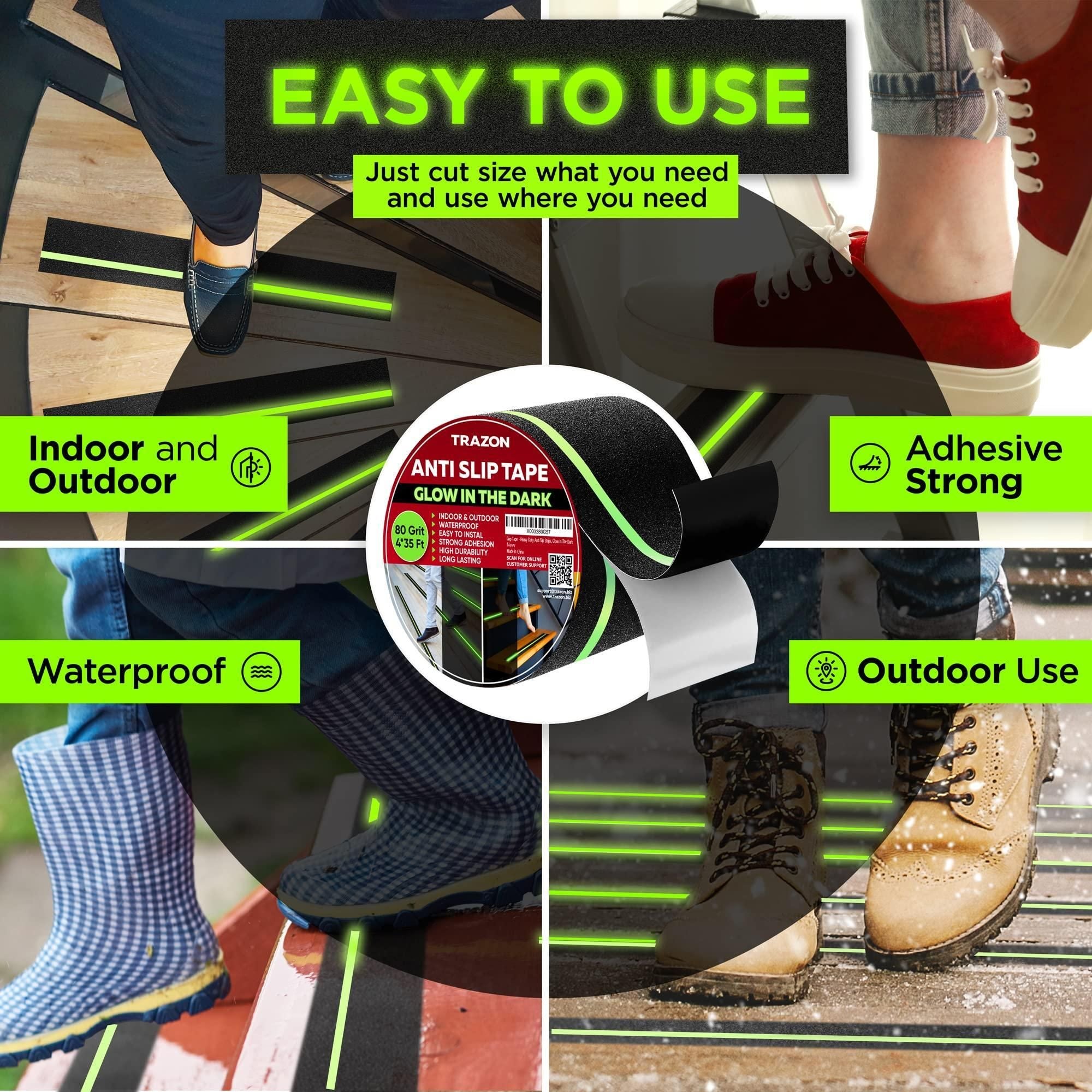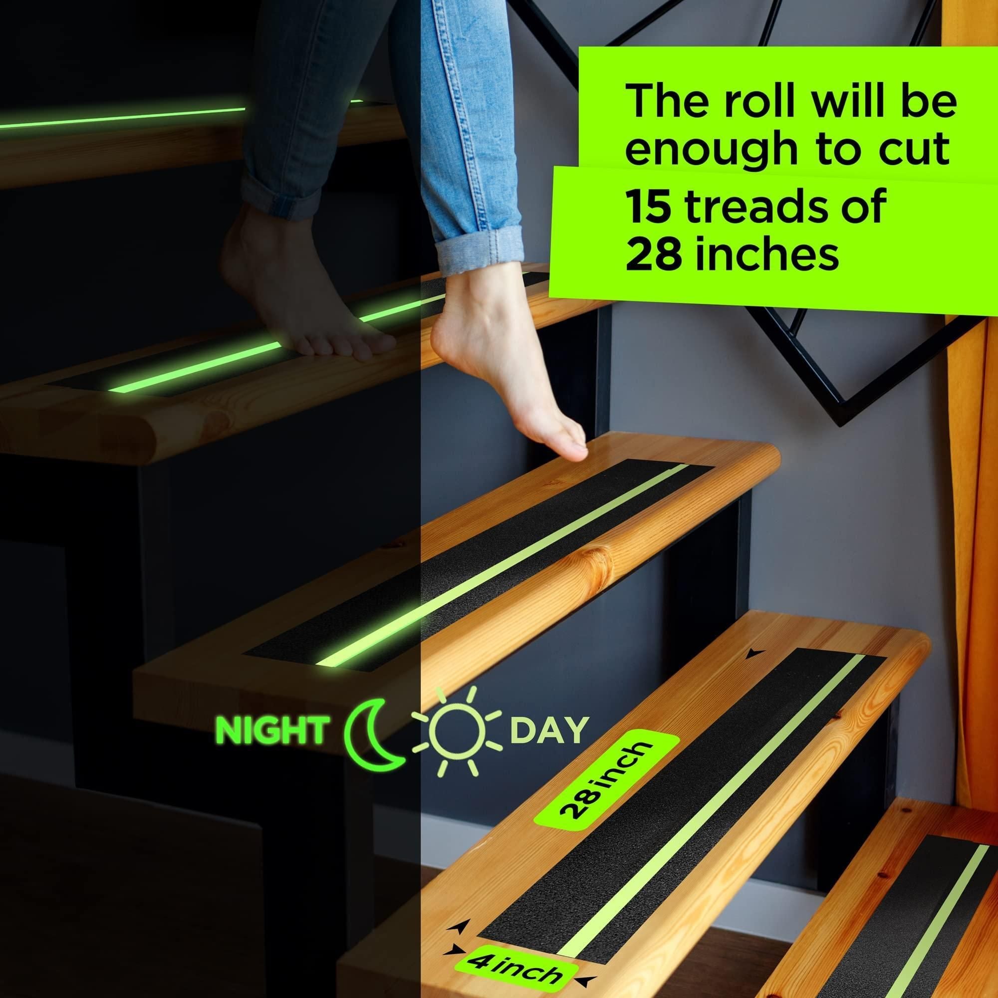 Grip Tape Heavy Duty Anti Slip Tape for Stairs 4 Inch x 35 Feet Black with Glow in The Dark Strips Outdoor Indoor Waterproof Non Skid Roll for Stair Steps Traction Tread Staircase Grips