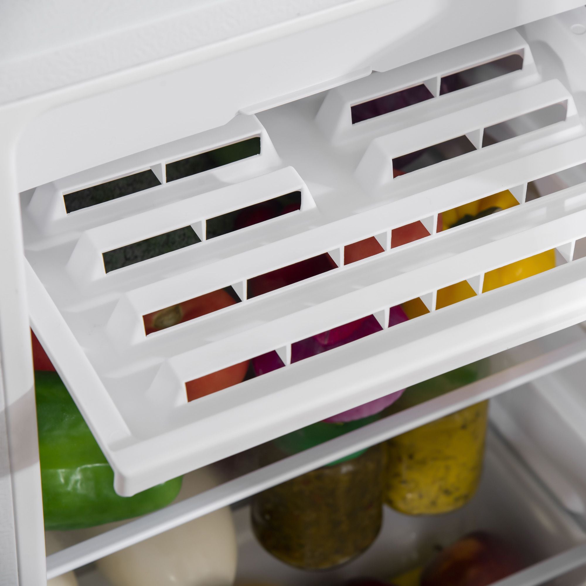 - PLENTY OF STORAGE: This compact fridge has 0.35Cu. Ft freezer compartment at the top and under is two shelves, wall storage in the door, and a crisper drawer to store any food that needs to be cold and stay cold. You can adjust the shelf to fit different-sized bottles or cans..