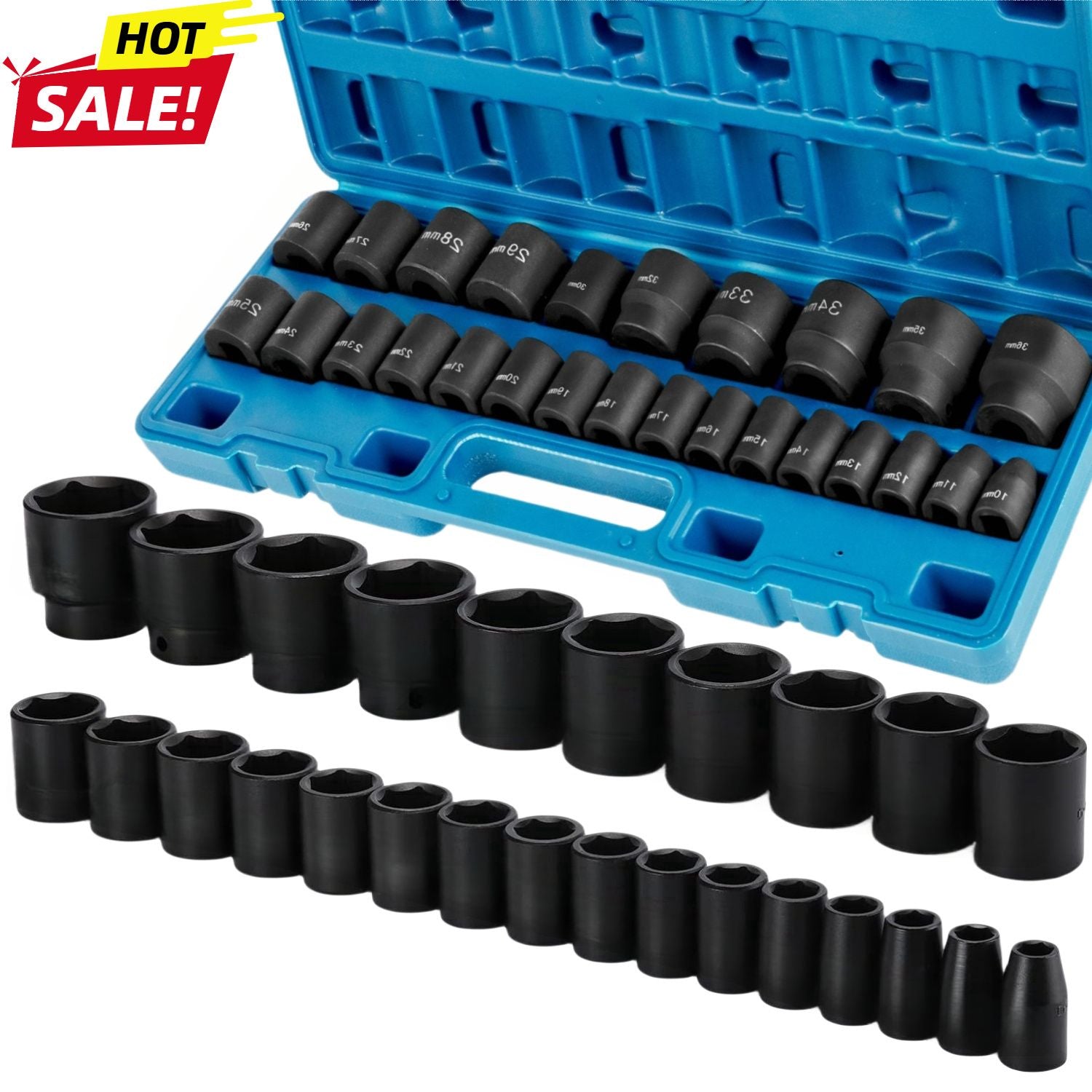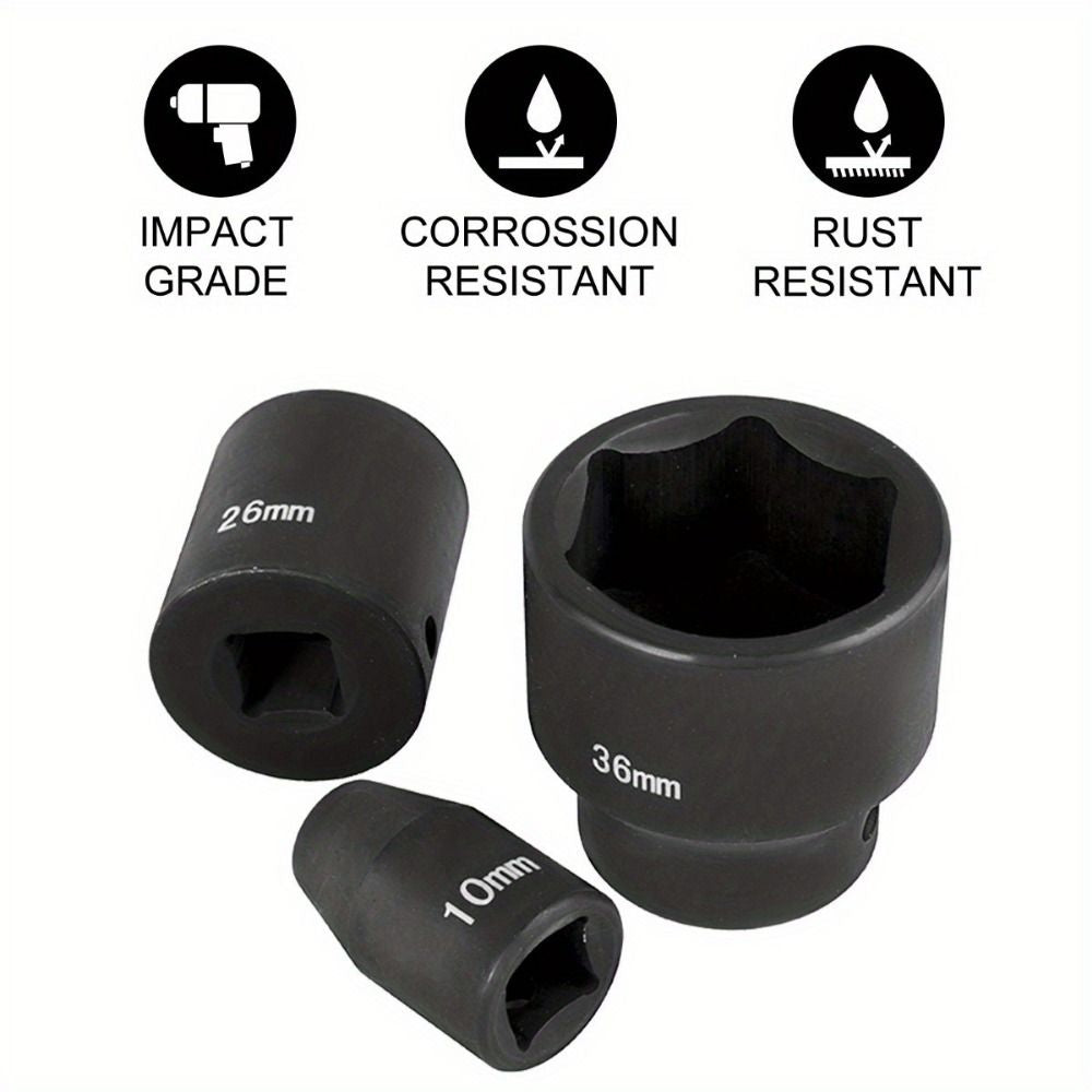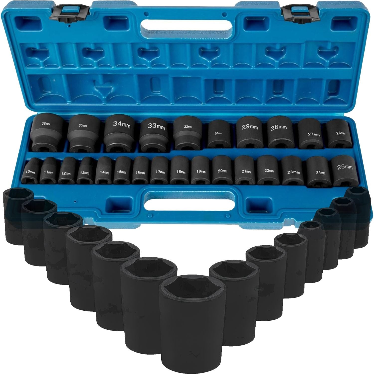 Impact Socket Set: 26 pieces, 1/2" Drive - CR - Mo material, 6-point and shallow sockets, Metric sizes 10mm - 36mm, Sturdy construction, comes with storage cage,