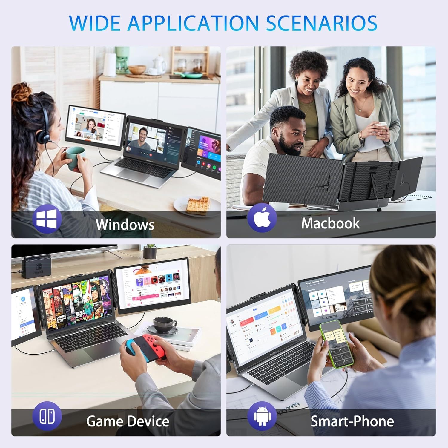 – Instantly turn your laptop into a 3-monitor workstation. Dual 14” side screens support both extension and mirror modes, allowing you to work on multiple tasks simultaneously and boost productivity by up to 300%.