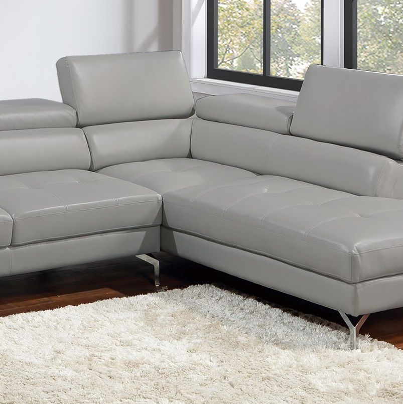 The sleek contemporary design of this sectional is magnified by the sleek design of the metal legs and tufted seat cushions. The adjustable headrests and one armrest allow you to have control over your comfort while the right-facing chaise provides spacious seating. Available in Light Gray, and White (Faux Leather).
