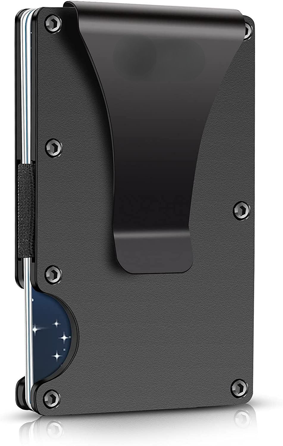 [Money Clip & Elastic Band]: The classical money clip is made of spring steel; it can be used to hold cash handy. Flexible elastic webbing greatly improved the card holding capacity; it's just suitable for card carrier; black aluminum slim cash credit card holder for front back pants pocket carry