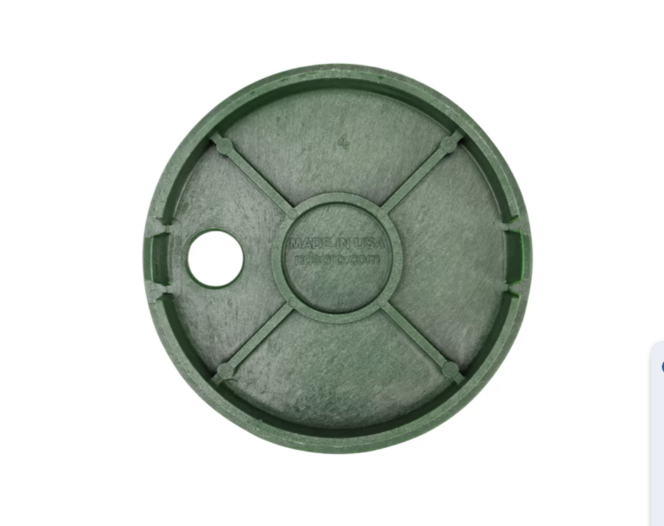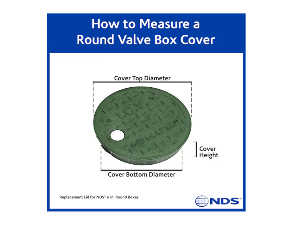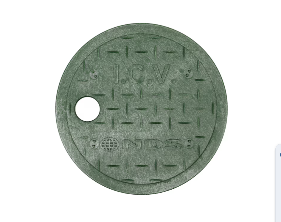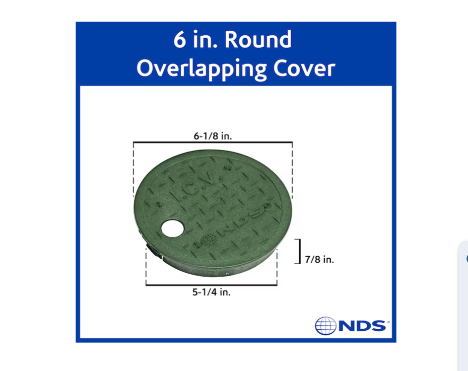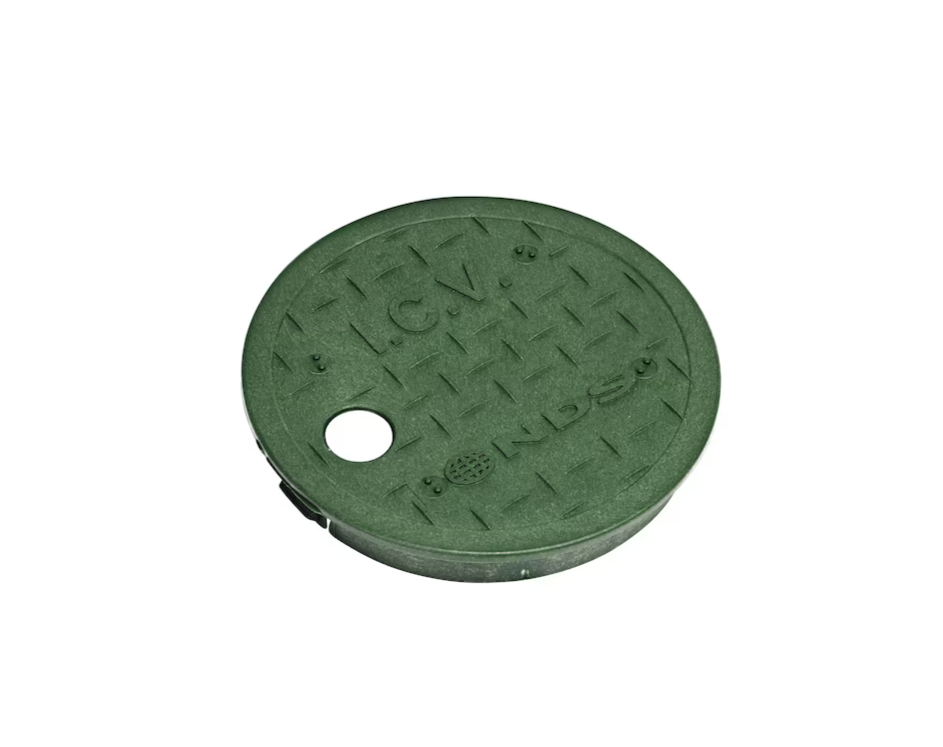 Replace a damaged or missing valve box cover with the 6 in. Round Valve Box Cover. Works with the 6 in. round valve box (107BC Retail) to cover a single valve or irrigation accessories and protect components from damage. Prevent damage due to the elements, pedestrian traffic, lawn care equipment, and potential vandalism with the 6 in. round lid on top of the 6 in. round valve box. Built for durability, the green irrigation control valve (ICV) cover features structural reinforcing ribs. Replacement cover snaps onto the 6 in. valve box and has a finger hole to remove the lid for maintenance. The valve box cover is made of polypropylene (PP) using a combination of recycled and virgin content and is treated with UV inhibitors to prevent fading and cracking due to sun exposure. NDS is a leading manufacturer of water management solutions and the trusted brand of professional landscape contractors since 1972. Check out the NDS website or reach out to us for technical support—our friendly, experienced team is here to help make your project a success.
