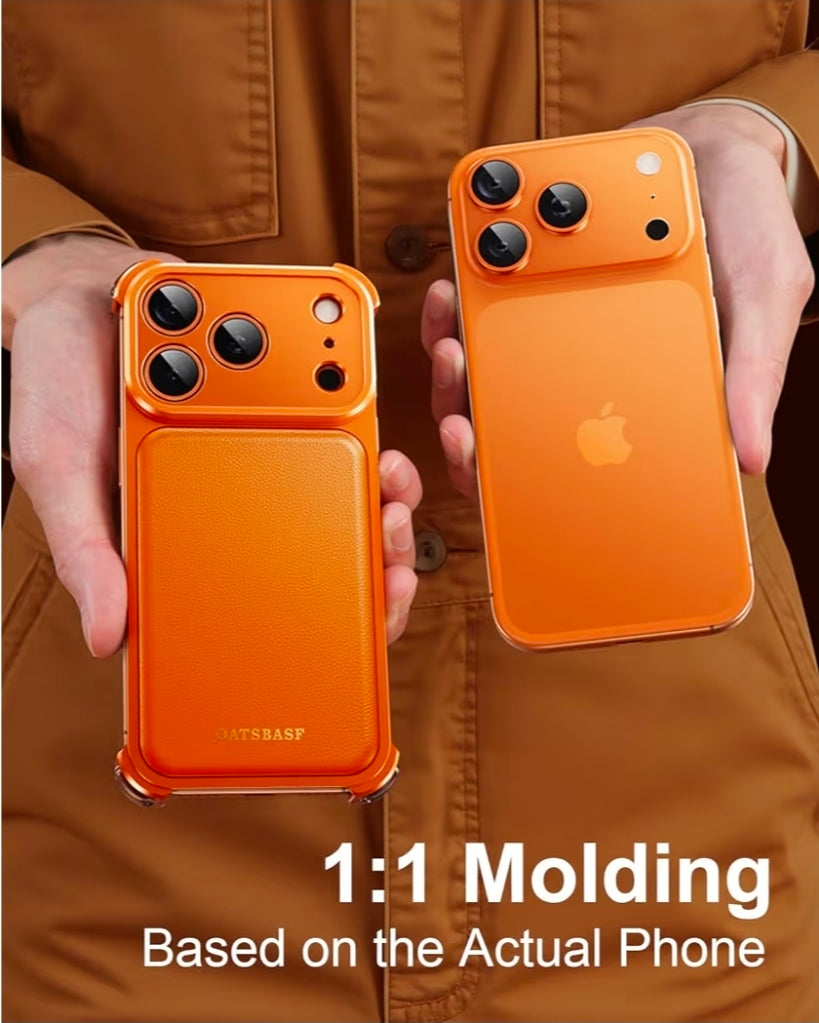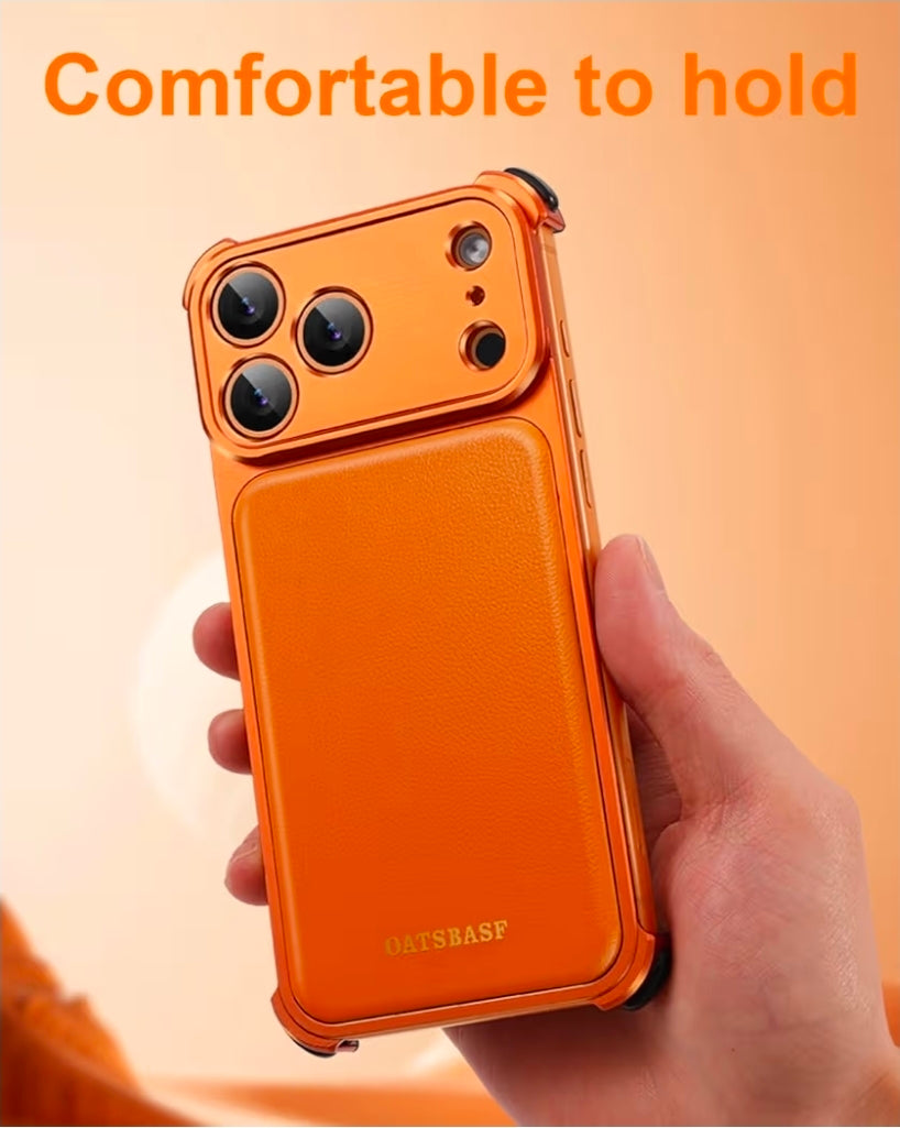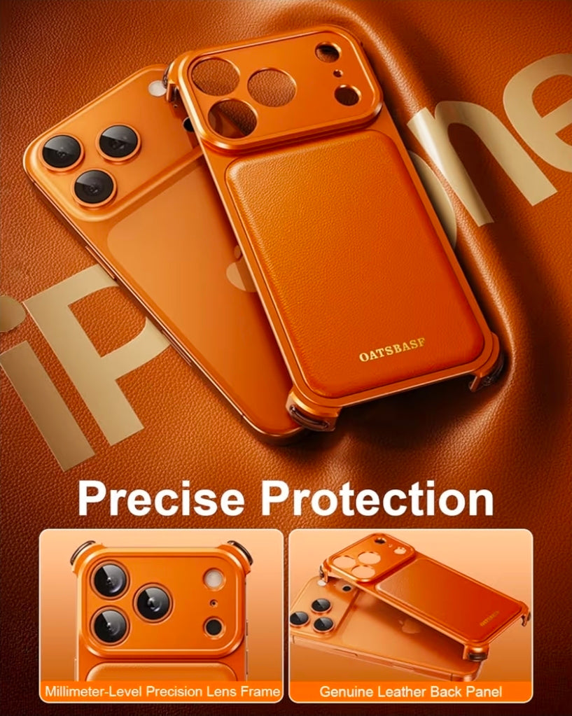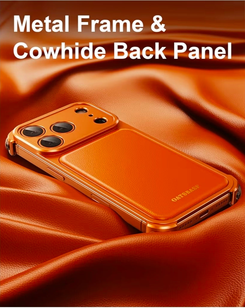 OATSBASF for iPhone 17 Pro Max Case, Full Camera Protection, Compatible with MagSafe Charger, Metal Frame Genuine Leather Back Panel Phone Case, Orange