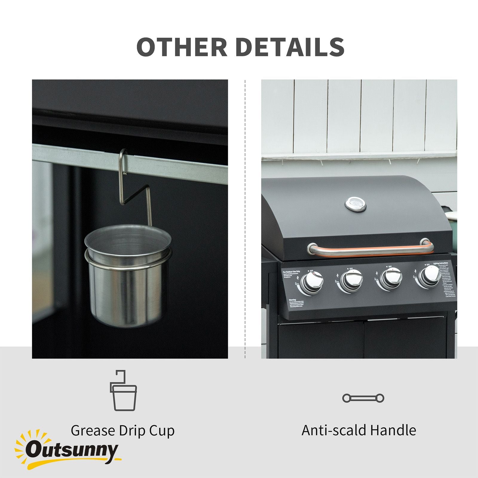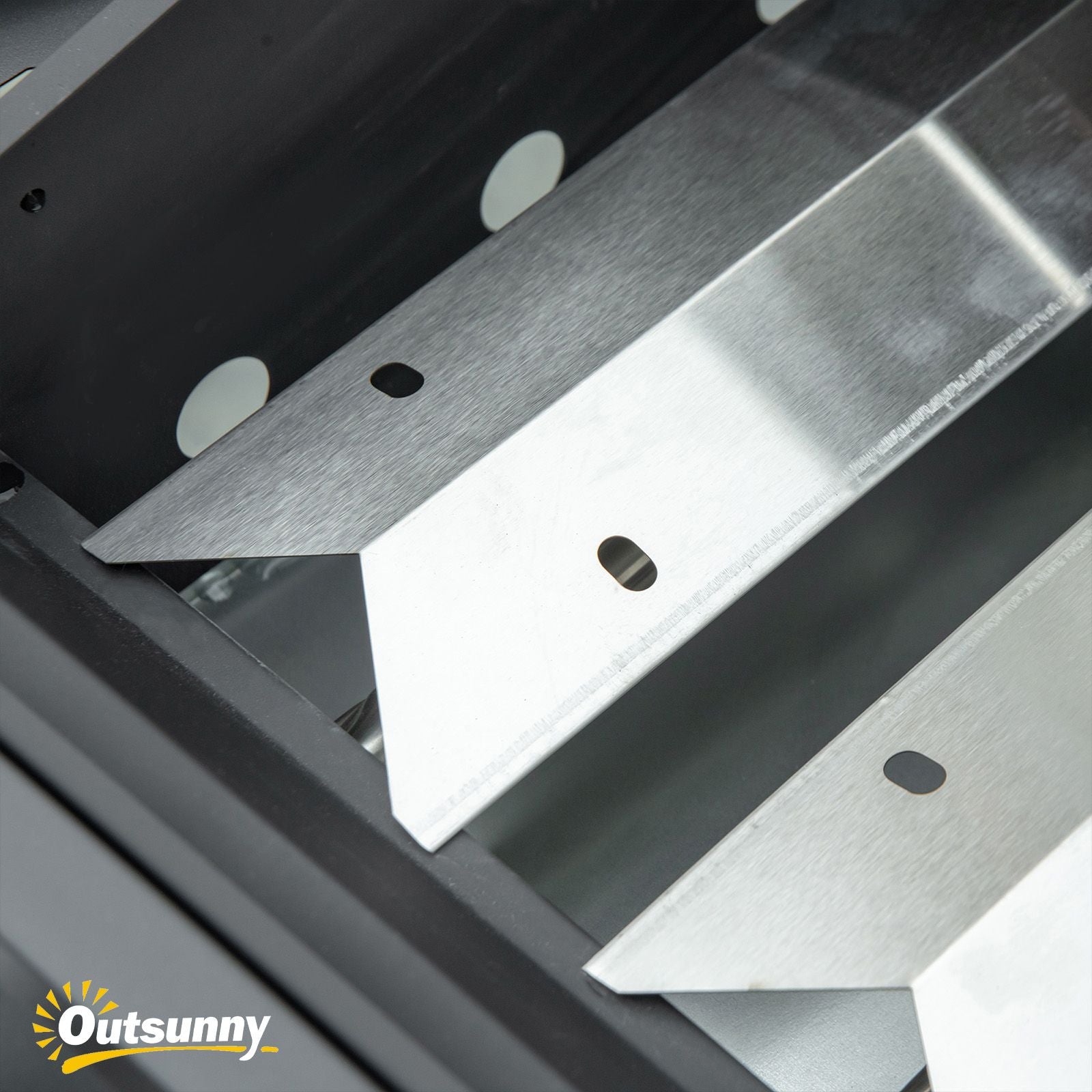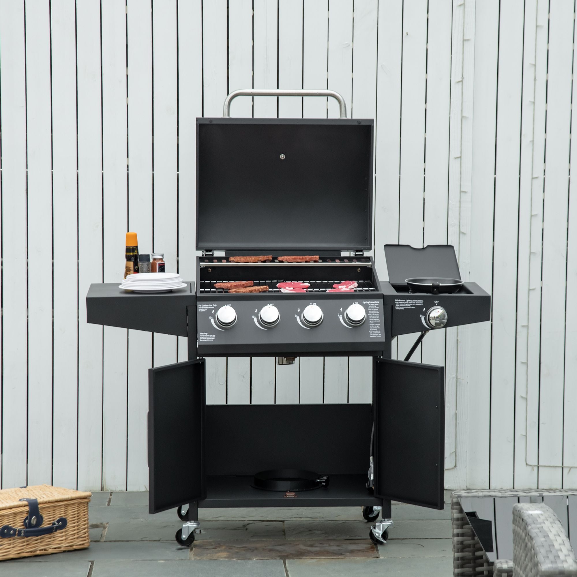 The 4+1 gas BBQ grill from Outsunny features four burners and a side burner, ideal for outdoor barbecue parties. The lid design helps preserve all the flavors. When preparing for your party, you can put all your grilling essentials and accessories within easy reach on the side tabletop. It includes two wheels is quite convenient for you to move it. Add the durable and safe BBQ and enjoy your cooking outdoors with complete peace of mind.