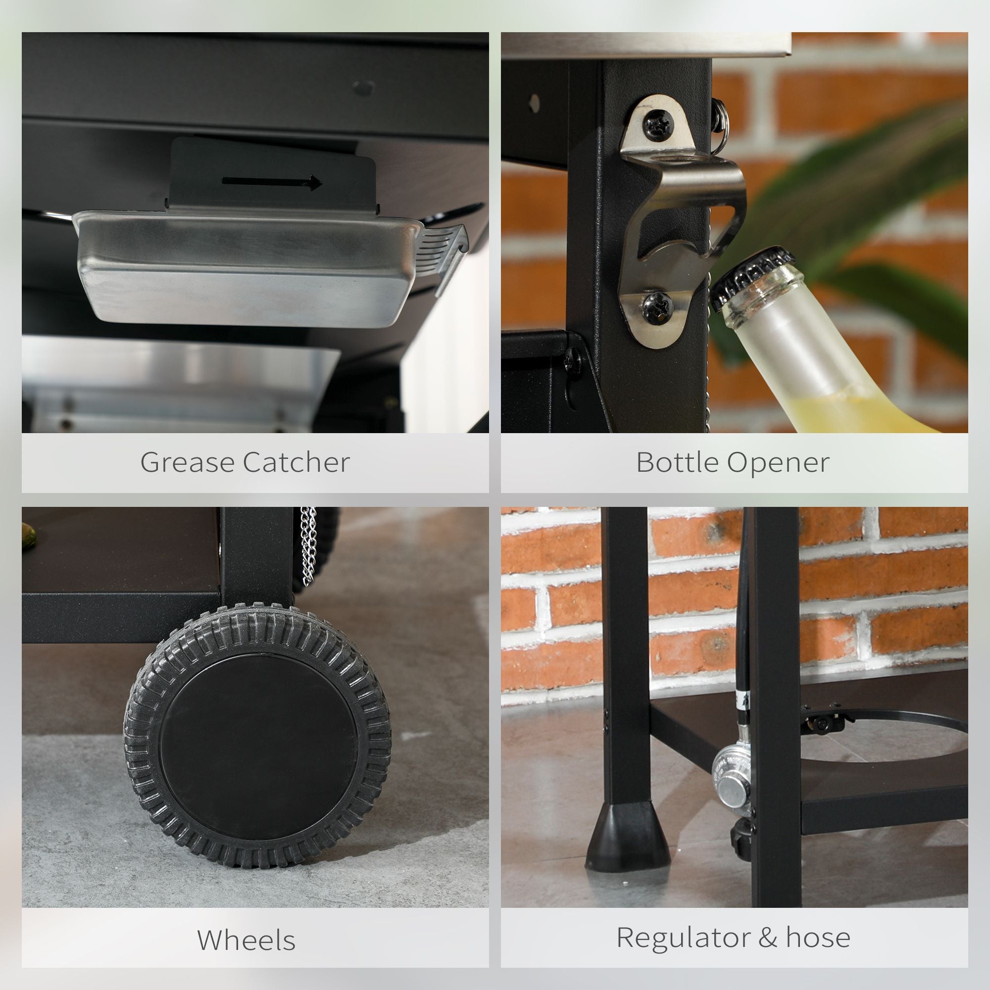 - Oh, So Much More: Our outdoor gas grill is quick to move with a set of two wheels, easy to clean with a grease catch down below, and it won't have you looking for a place to pop open your brewski with a bottle opener on the side. The regulator and hose come pre-installed.