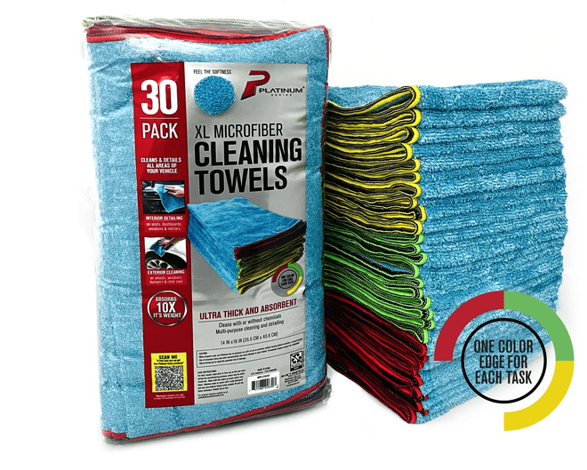 Upgrade your cleaning arsenal with the Platinum Series XL Multi‑Purpose Microfiber Cleaning Towels. This 30-pack features oversized 14″ × 16″ towels in vibrant yellow, green, and blue—perfect for auto detailing and household chores. Made from ultra-thick 300 GSM microfiber, these towels trap dirt, dust, and grime while remaining lint-free and non-abrasive. Whether used wet or dry, they provide streak-free results on paint, glass, dashboards, countertops, and more. Designed for durability and machine washable for countless uses, they’re ideal for professionals and home users alike .