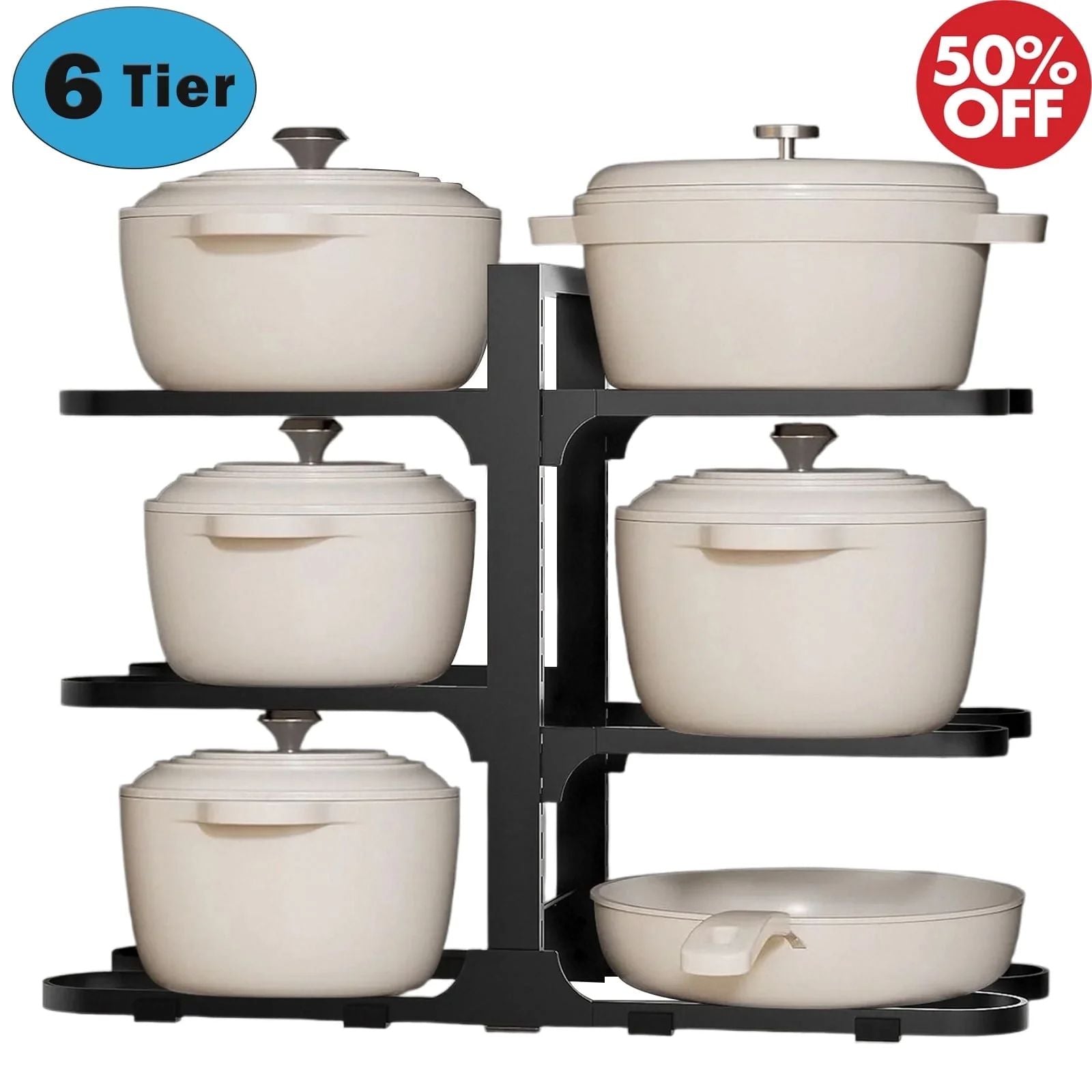 6 Tier Snap-on and Adjustable Pots and Pans Organizer Rack for Under Cabinet,Super Sturdy Construction Heavy Duty Thickened Carbon Steel Selection, Strong Load Capacity, Can Hold 100 Pounds, Each Layer Has 15 Pounds Powerful Load Capacity, Can Easily Hold Your Heaviest Cookware, Including Cast Iron Pans, Heavy Duty Frying Pans, Dutch Ovens, Ceramic Pans, Etc.Definitely A Great Helper For Organizing Your Cookware.