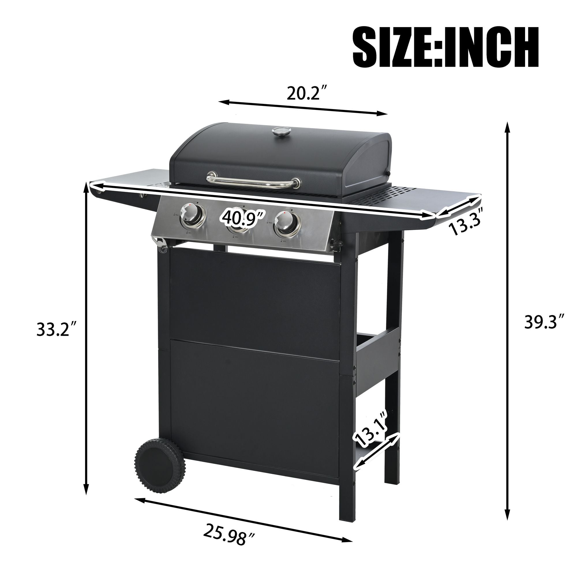 Propane Gas Grill 3 Burner Barbecue Grill, Stainless Steel 26,000 BTU Patio Garden Barbecue Grill with Two Shelves, Lid, Wheels and Bottle Opener