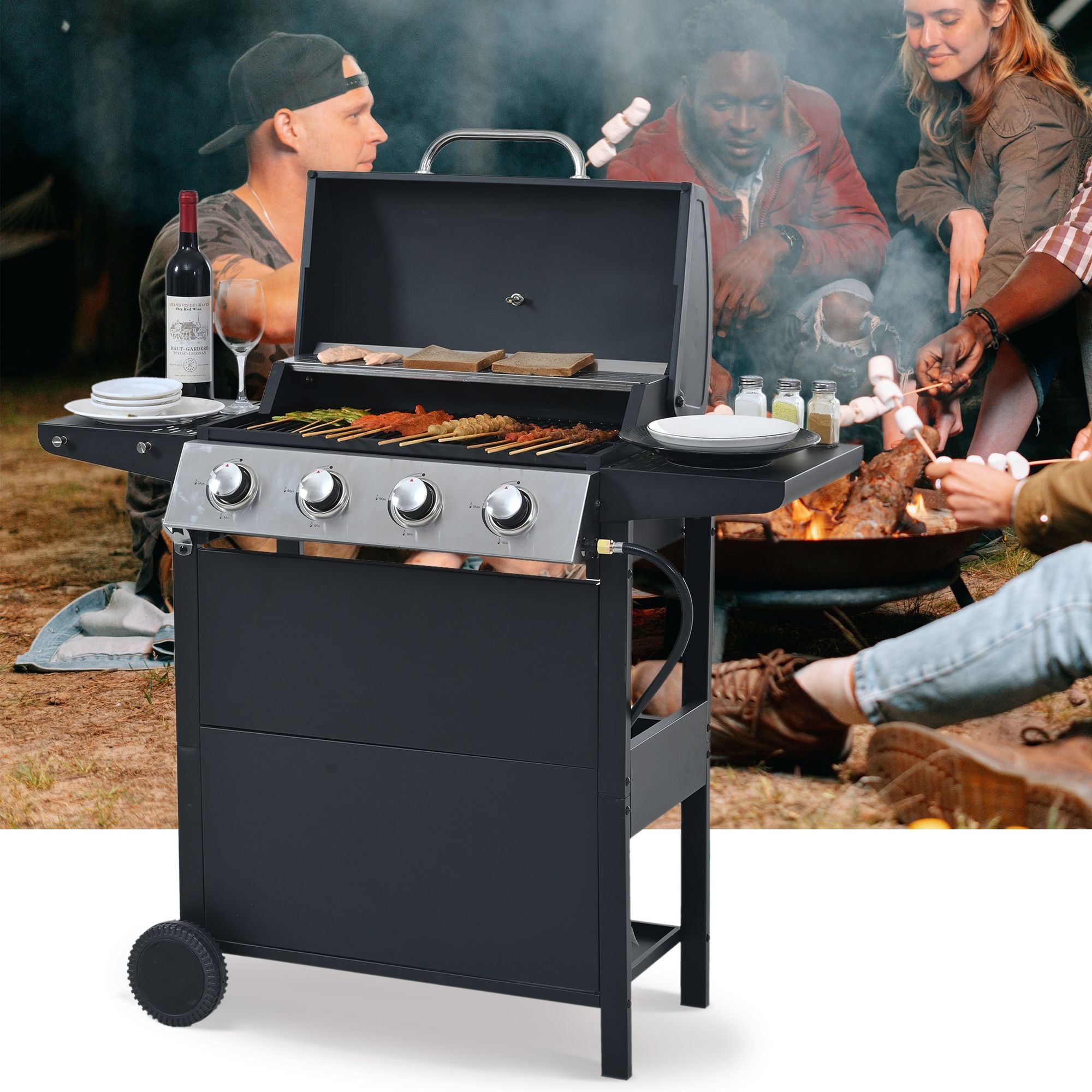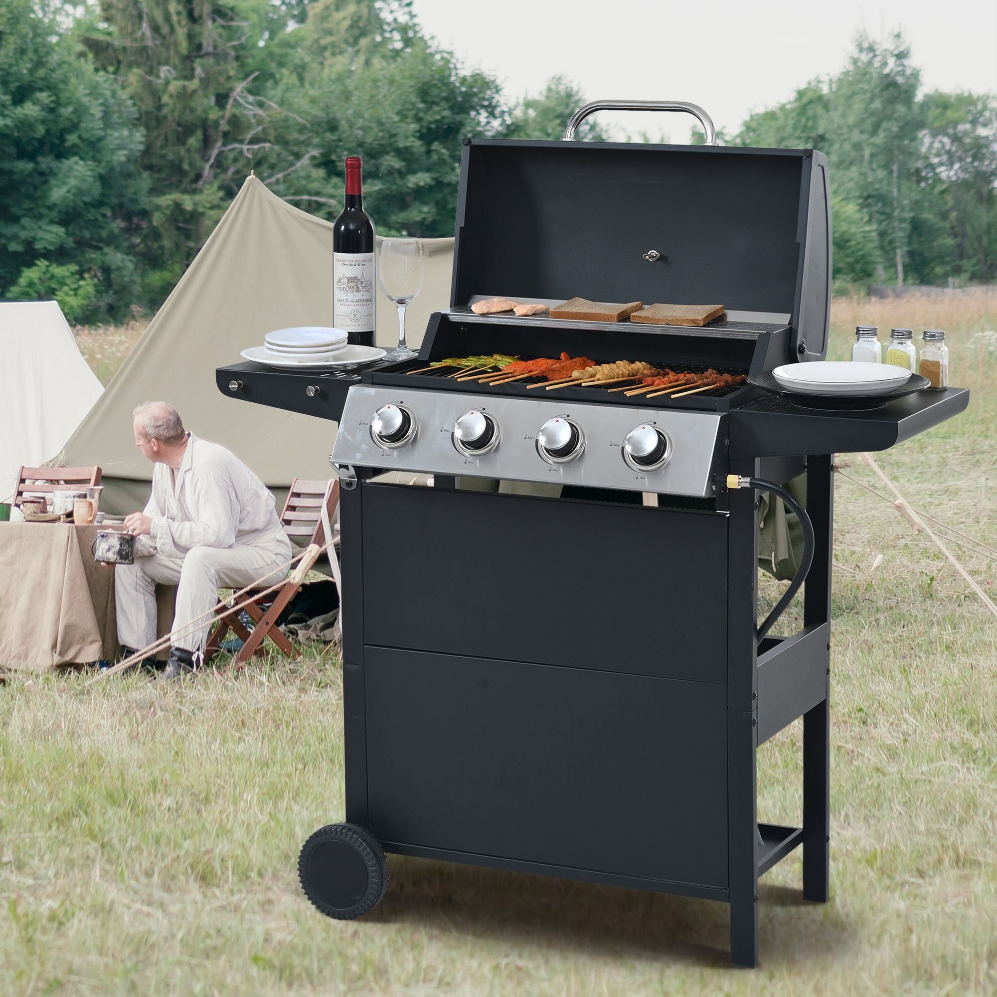 Propane Gas Grill 4 Burner Barbecue Grill, Stainless Steel 34,000 BTU Patio Garden Barbecue Grill with Two Shelves, Lid, Wheels and Bottle Opener