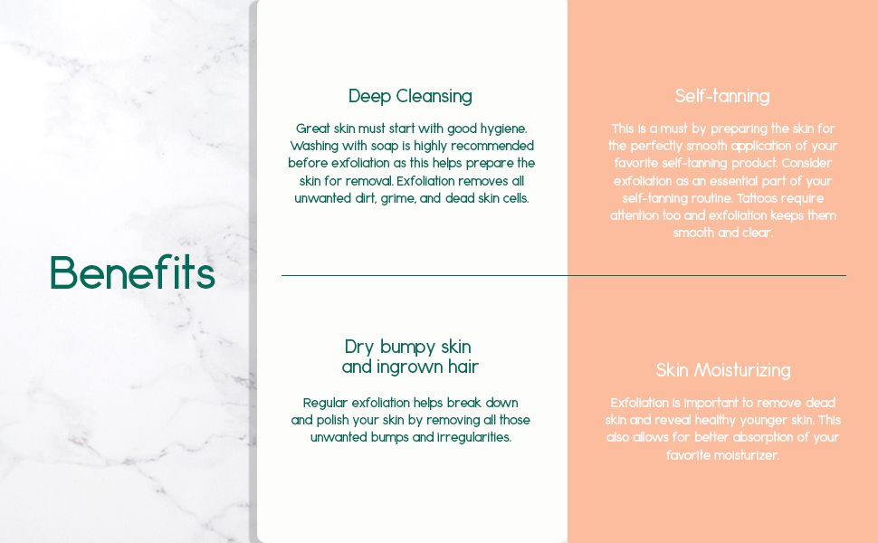 - Skin Moisturizing. Exfoliation is important to remove dead skin and reveal healthy younger skin. This also allows for better absorption of your favorite moisturizer.