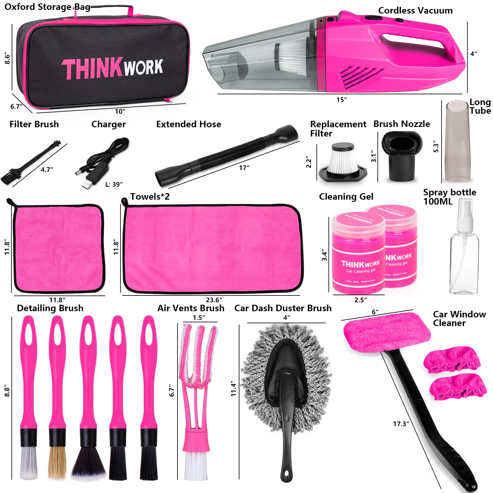 THINKWORK Car Detailing Kit Interior Cleaner, Car Cleaning Kit with 8000PA Cordless Pink Handheld Vacuum Cleaner, Car Interior Detailing Brush Set, Pink Car Accessories, Gift for Women
