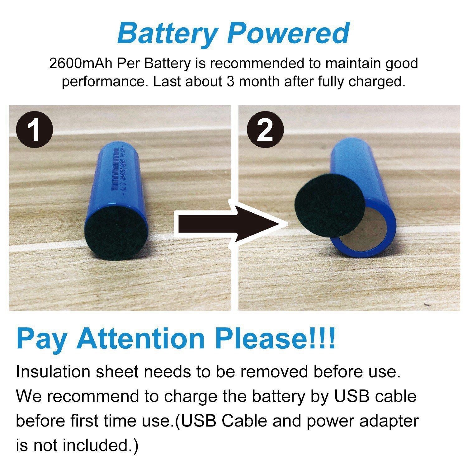 *2Pcs 18650 Lithium batteries work regularly for 8-12months. 2600mAh per Battery(included) is recommended to maintain good performance.