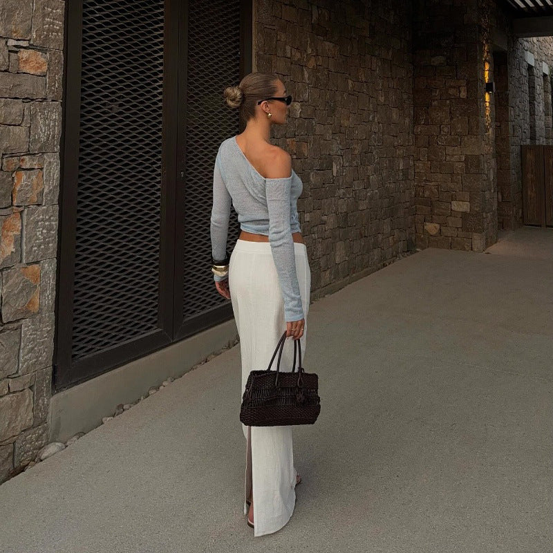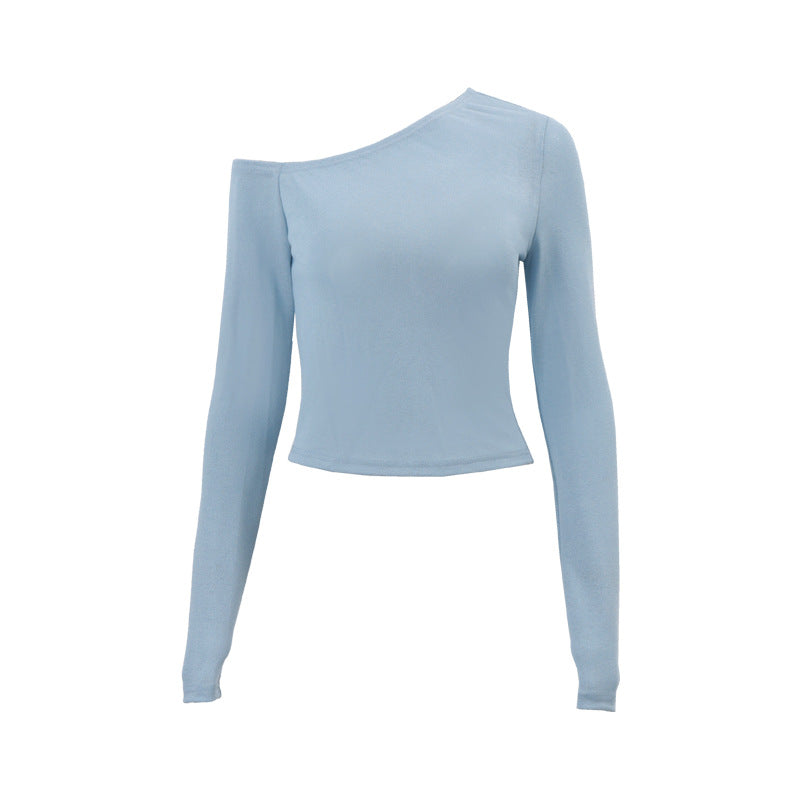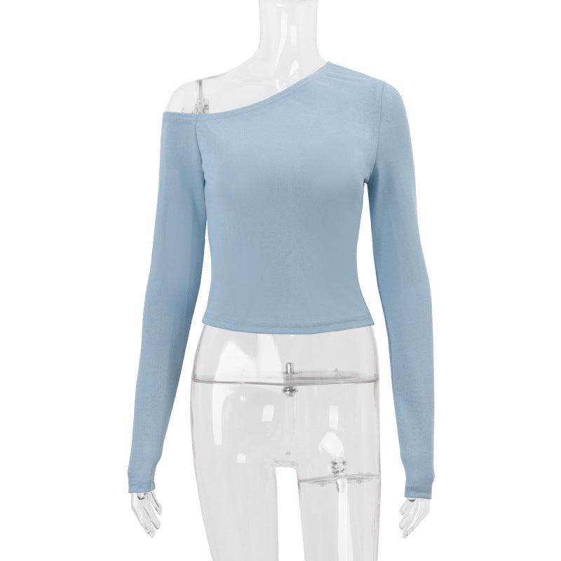 Women Clothing Autumn Sexy Solid Color Diagonal Collar Cropped Knitted Long Sleeved T shirt Top