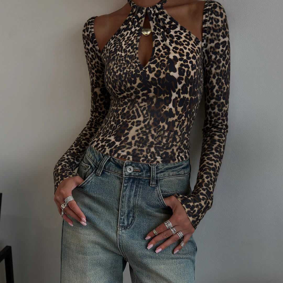 Women Clothing Autumn Sexy Vintage Leopard Print Halterneck Long Sleeved Sexy Top for Women