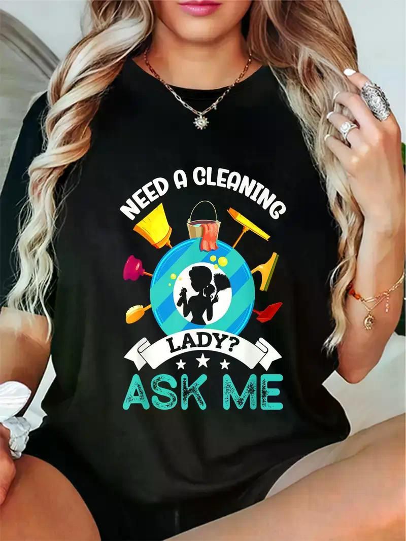 Women's Cleaning Lady Graphic T-Shirt - "Need a Cleaning? Ask Me" Design with Mop, Broom & Pail, Casual Short Sleeve